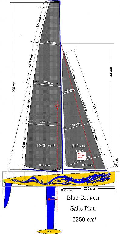 Si fa un rapporto tra la distanza tra il boma e il punto di attacco dello strallo sullalbero e tra la distanza della coperta e il punto di attacco dello strallo. Dato che il piano della coperta sale verso prua la distanza non sara` 755 ma almeno 1 cm in meno: supponiamo che il boma nel punto di attacco disti circa 2 cm dalla coperta, quindi usiamo 745 cioe` 20 mm piu` dei 725 di partenza. Data la tipologia di calcolo conta solo sapere bene la distanza tra boma e coperta nel punto dattacco mentre lesattezza al cm delle altre quote ha molta poca importanza sul risultato finale