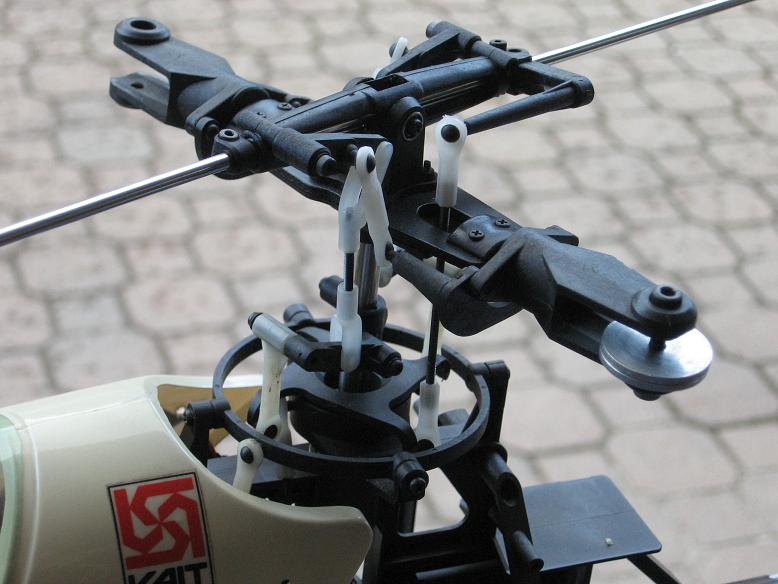Il Kalt elettrico di cui ho pubblicato la foto in precedenza ed il Kyosho concept, invece, avevano la particolarità di avere il piatto oscillante fisso nell'asse verticale. Si muoveva solo per il ciclico. Il passo collettivo era invece affidato ad un cursore che si muoveva lungo l'albero rotore tra la corona principale ed il piatto stesso.