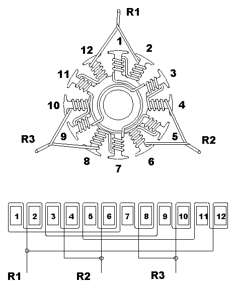 per gli axi, ma anche in generale sono le misure dello statore: 22mm diametro, 8mm spessore e 26 il numero di spire, che in questi motori con statore a 12 poli/denti è al 99,9999% un distrubuited LRK , configurazione a triangolo, in realtà le spire fisicamente per dente sono 13 ma siccome è un distribuited wing, si contano quelle fatte su 2 denti vicini, dallo schema si capisce meglio.