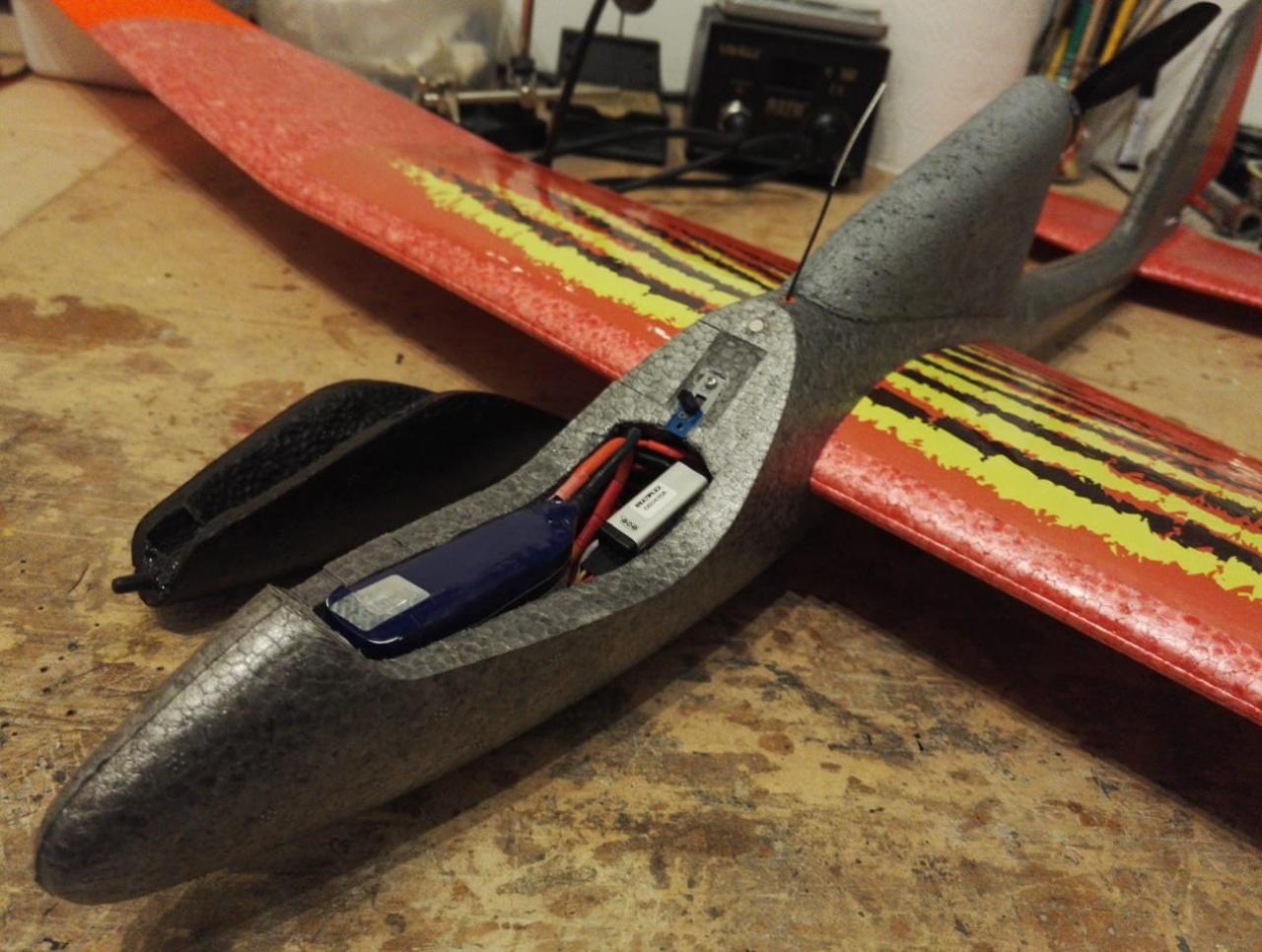 Il Peso in odv è di 330g, non proprio leggerissimo ma l'aumento di peso sulla coda mi ha costretto ad montare delle lipo grandicelle 3s da 850mAh per tornare a bilanciarlo. Speriamo sia docile e non sia troppo veloce...