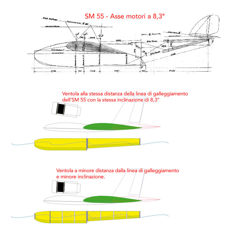 Il problema del momento picchiante prodotto dal motore c’è di sicuro ma è presente in quasi tutti gli idrovolanti. Guardando ad esempio il leggendario SM 55 si vede che le eliche sono molto distanti dalla linea di galleggiamento e per questo motivo l’inclinazione del loro asse era di +8,3°.