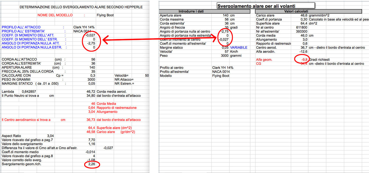 Il foglio di calcolo “Hepperle.xls” non l’ho realizzato io ma ho scaricato quello del post #16 e ho inserito i dati del mio modello nei vari campi. Ho corretto il valore “COEFF. DI MOMENTO DELL’ATT.” portandolo da 0,027 a -0,027 e in questo modo lo ”Svergolamento geom. richiesto” è diventato 2,26: va inteso come -2,26° ??