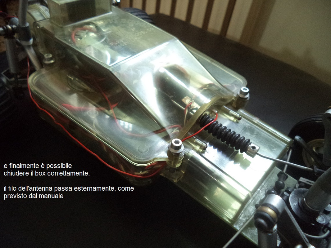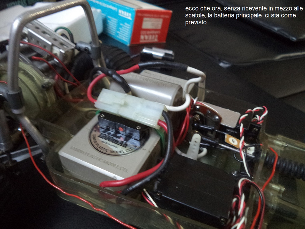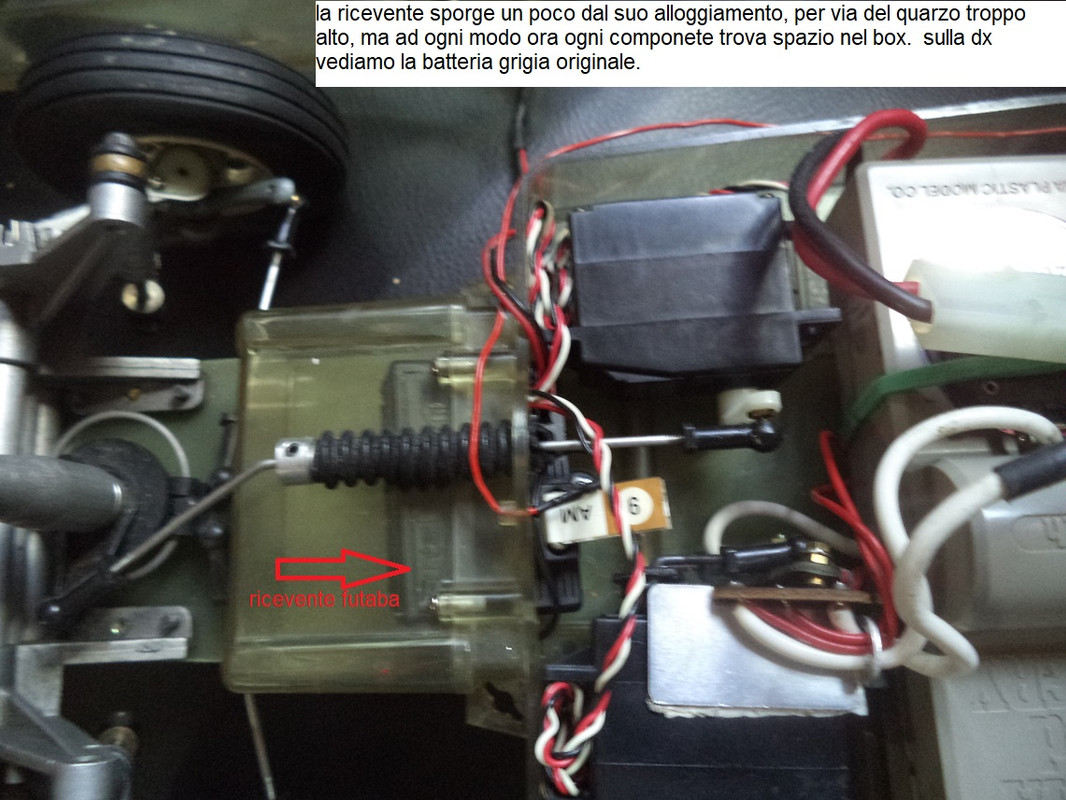 Ho abbibato alla radio sanwa AM in dotazione una mia vecchia ricevente futaba 27mhz, che essendo più piccola riesce ad entrare quasi completamente nell'alloggiamento previsto.
