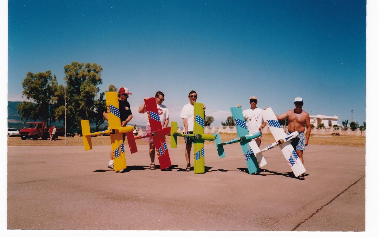 Era un modello per un 40-46 c.i. ,l'ala era praticamente la stessa di quella del Ready, le uniche modifiche riguardavano il comando alettoni e l'attacco alla fusoliera dato che il Ready era un ala alta. Al nostro campo ne vola ancora qualcuno, quindi il materiale non era del tutto male. Nella foto uno squadrone che avevamo portato al Gargano quando Bettini organizzava laggiù la settimana aeromodellistica. Il modello della foto precedente ha l'ala originale del ready modificata per la prova del prototipo.