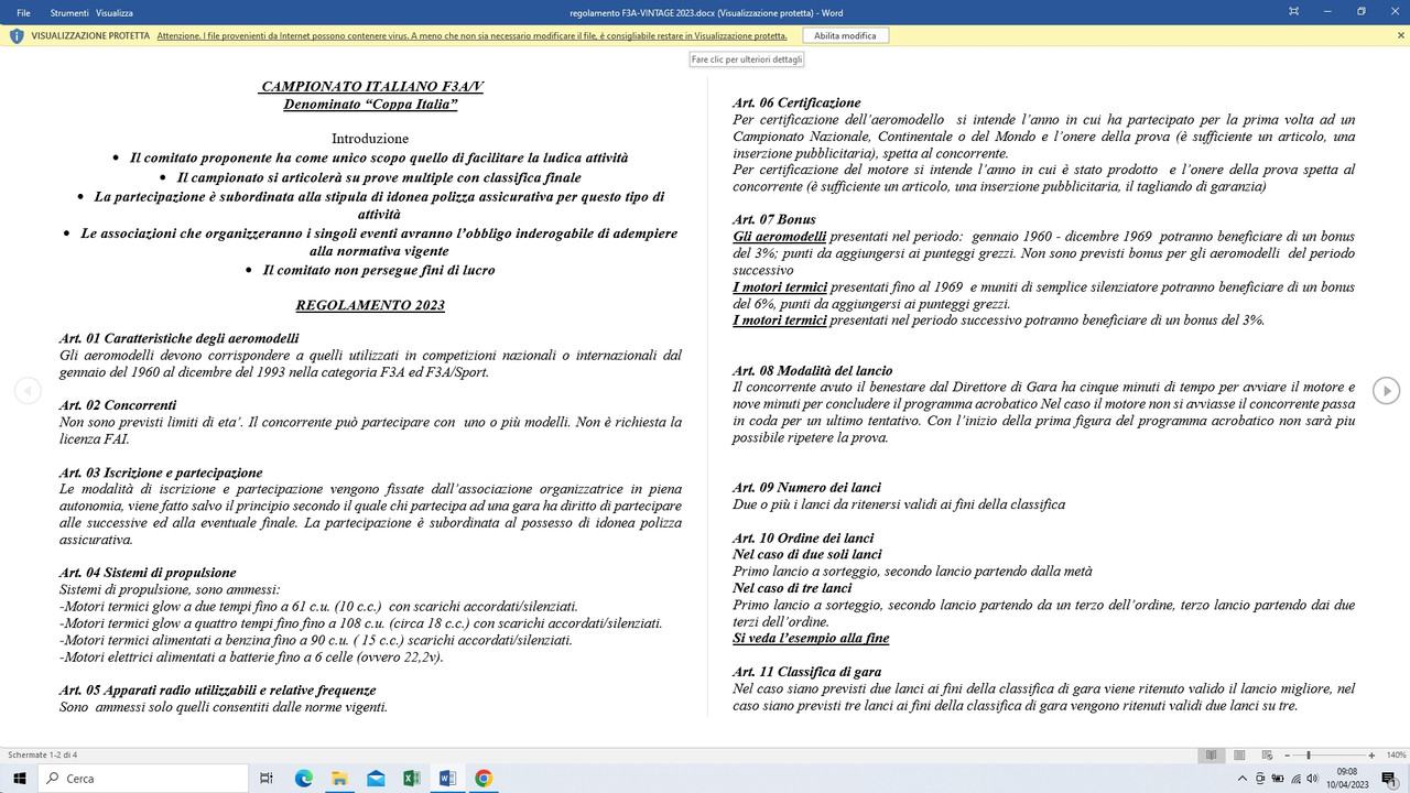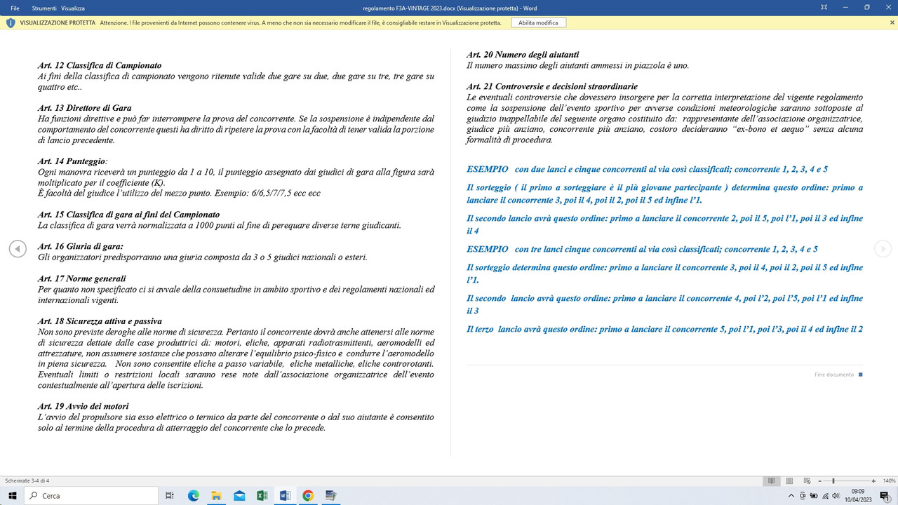Non so per quale motivo trovare indicazioni in rete relative al regolamento F3A-V è sempre una cosa difficile, io non partecipo da tempo alle gare, ma ricevo via mail le informazioni relative. Ecco il regolamento valido per il 2003.