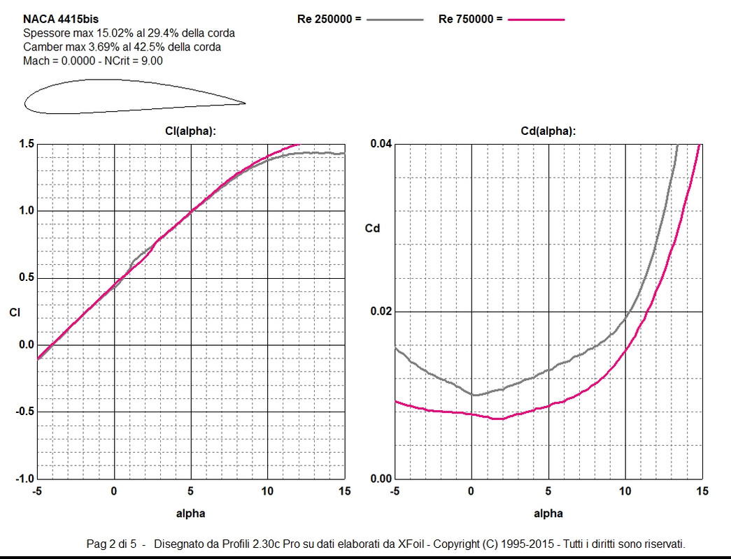 Per quanto riguarda il 4415 bis in particolare come si vede dal grafico Cl/alfa mentre la curva per Re 250K diventa orizzontale ( stallo ) verso i 10 gradi, l'altra per Re 750K ( velocità 3 volte superiore a parità di altri fattori ), continua a salire.