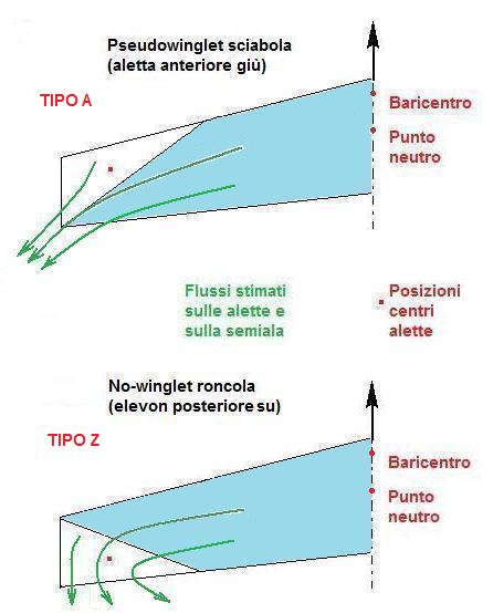 Inoltre nei tipi A le 2 parti mobili anteriori sono criticabili perché lavorano controvento (come le portiere di alcune pericolose automobili). Però con le 2 alette di estremità convergenti, stabilizzanti sul bordo di entrata, cioè inclinate ad ala di gabbiano, si hanno anche dei vantaggi: - possibile miglioramento della stabilità direzionale (laterale + trasversale) del tuttalino, - possibile minor resistenza indotta per flusso a sciabola anzicché a roncola. Ho già trattato quest'argomento alla pagina Web www.pseudospecie.it/ARC.htm Vedere il capitolo "I modelli A-RC e MIX-RC non esistono ancora", in particolare colà vedere l'immagine flussi.jpg ![]() L'argomento andrebbe tuttavia rimeditato. | |