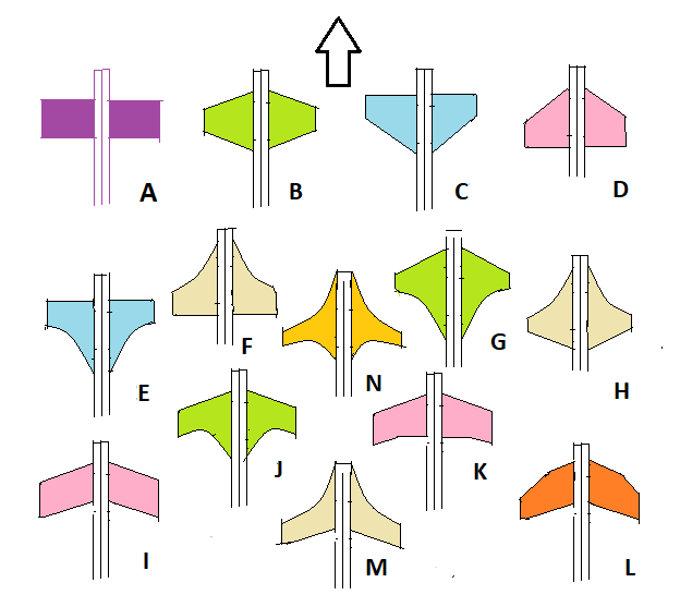 | Canardini. Costruendo i miei canardini di cartoncino mi sono chiesto quanto siano migliorabili le prestazioni modificando la forma in pianta delle alette canard. Debbo subito dire che dai risultati sperimentali mi sembra che l'efficienza muti pochissimo in funzione della forma delle alette del timone anteriore, mentre sicuramente l'efficienza muta assai per la superficie ed incidenza delle alette, a parità del resto del canardino. Ciò non ostante ritengo che qualche vantaggio, pur scarsamente apprezzabile nei modelli di cartoncino, si potrebbe ottenere anche dalla forma in pianta, soprattutto in modelli più grandi. Supponete dunque che superfici ed incidenze di alette diverse in pianta vengano ritagliate in modo da rendere sempre i miei canardini stabili (quasi sempre). Poniamo cioè che nient'altro influisca sull'efficienza di planata, tranne proprio la forma delle alette del timone anteriore. Vi chiedo quale forma in pianta dovrebbe essere meglio aerodinamicamente, a parità di tutto il resto del canardino, lasciando da parte eventuali ragioni estetiche e trascurando eventuali problemi dovuti al materiale. Per agevolare la risposta allego un mio schizzo che contempla solo alcuni casi possibili dei timoni anteriori dei canardini. Nel modello Paper 2 bis ho proposto il caso B) con alette rastremate opportunamente allungate. |