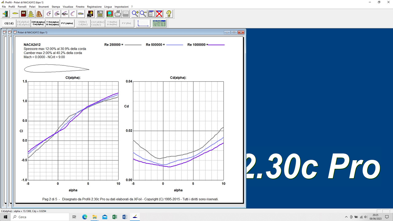 Nell'immagine ricavata col programma in questione puoi notare come il Cp varia,oltre che con alfa, anche col numero di Reynolds che , a sua volta, dipende da corda dell'ala e dalla velocità. Non fare caso al profilo che ho usato, vale solo come esempio. |