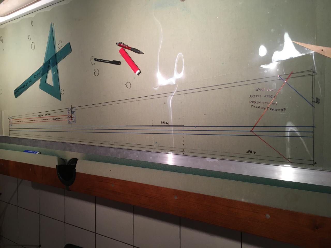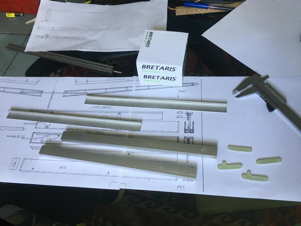 Oggi speravo di laminare il primo longherone in carbonio ud, ma la con la pioggia è arrivata anche l’umidità, che non va d’accordo con l’epossidica. Quindi ho dirottato il lavoro verso la progettazione e la realizzazione degli aerofreni. Li ho progettati intorno ad un profilati a U e a L che ho trovato in casa. Ho preparato anche il primo pannello in pet, con le indicazioni di posizionamento dei tessuti.