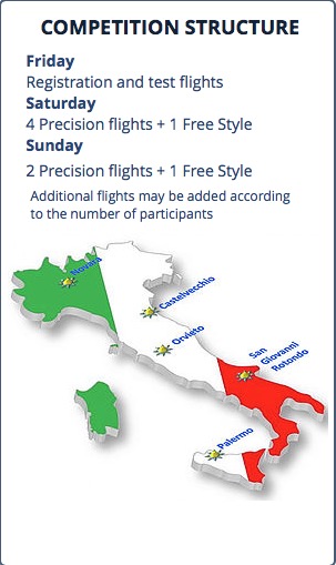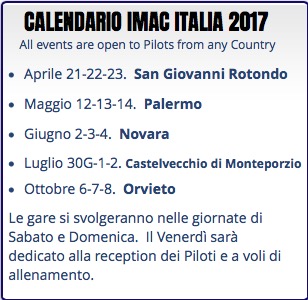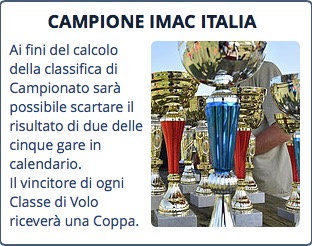 Quest'anno si realizza il primo Campionato IMAC ITALIA, che è strutturato in base alle seguenti cinque gare: 1. San Giovanni Rotondo, 21-22-23 Aprile; 2. Palermo, 12-13-14 Maggio; 3. Novara, 2-3-4 Giugno; 4. Castelvecchio di Monteporzio, 30G-1-2 Luglio; 5. Orvieto, 6-7-8 Ottobre. Le gare si svolgeranno il Sabato e la Domenica, permettendo ai Piloti di realizzare fino a sei voli di precisione, di cui due sconosciuti. Cui si aggiungono due voli di Free-Style. La gara di Novara è inserita nel circuito Internazionale dell'Acro Cup IMAC e quindi vedrà la partecipazione di un buon numero di Piloti stranieri. In base alla performance realizzata nelle gare locali ogni Pilota cumulerà punti al fine di conseguire il titolo di Campione IMAC ITALIA per ognuna delle Classi di Volo di precisione e per il Free Style. Al fine del calcolo della classifica di campionato, ad ogni Pilota sarà consentito di scartare due dei cinque possibili punteggi conseguiti. Potrete studiare i dettagli del campionato e iscrivervi presso: www.mini-iac.it |