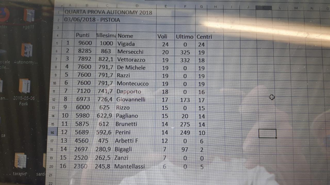 ... Sul sito la classifica, completa dei dati dei lanci... è online da ieri, prima ancora che rientrassimo a casa, grazie all'efficientissimo webmaster che, anche se è incasinatissimo con il lavoro, dietro le quinte agisce rapidamente. Vedi in home page Autonomy F5J – Per alianti radiocomandati da termica e nella pagina dedicata Pistoia 3/6/2018 – Autonomy F5J Se devo dare precedenza nello scrivere qualcosa... sicuramente più che parlare della classifica, vorrei ringraziare ancora una volta Vito e tutto il gruppo dell'AMC Pistoia che ci ha regalato 2 giorni splendidi con un tempo bellissimo, condizioni termicose e un'accoglienza e ospitalità a dir poco meravigliose. Grazie davvero, è stata una grande e allegra festa, immancabile, come lo scorso anno ![]() Per il resto, ieri eravamo a zonzo in molti e in vacanza da tutto e anche dal telefono e dal pc: ogni tanto capita e fa bene alla salute. Per ora anticipo solo qualche foto, a seguire spero che altri scrivano la loro ![]() classifica ufficiale ![]() gruppo ![]() parte del gruppo in preparazione e a tavola ![]() ![]() ![]() new entry Francesco Arbetti con i roveretani ![]() e Bigagli che l'anno scorso ci aveva fatto da fotografo ufficiale e quest'anno ha partecipato con un inside nuovo fiammante ![]() nei prox giorni... il resto ciaooooo