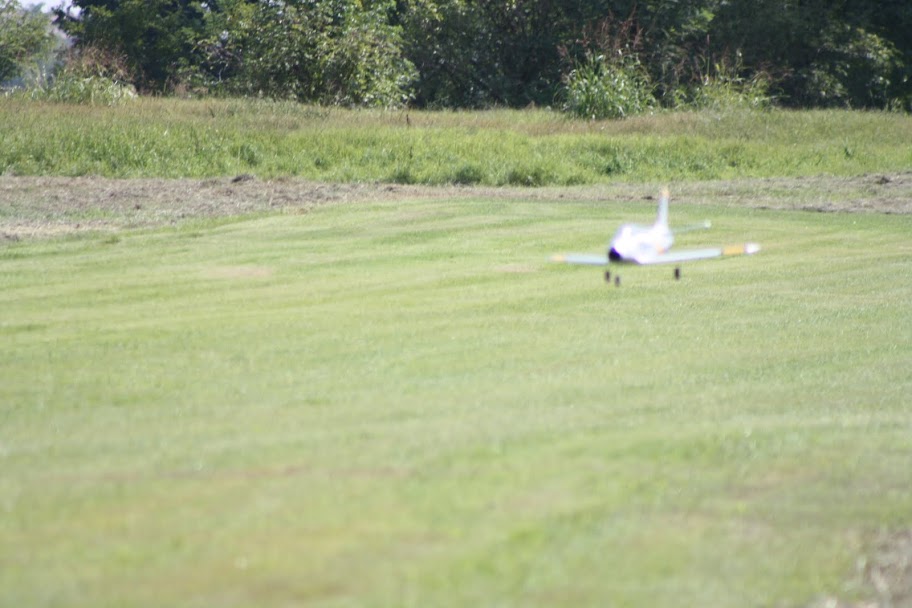 E' in verità talmente difficile da far atterrare, che nonostante un approccio piuttosto corretto (scusate la pessima qualità dello scatto, ma era davvero un missile) Ho avuto una brutta sorpresa: la ruota (anche se maggiorata rispetto a quelle stock del kit) si è impigliata in unasperità del terreno, e ha strappato lala fuori dalla baionetta: nulla di grave, anche se ora dovrò aprire lala per verificare come stanno le centine e (presumo) rifare la sede della baionetta. Il consiglio è: TOGLIERE i carrelli, davvero non servono a nulla, il decollo è difficile e pericoloso, e ion atterraggio sono una mina vagante. Molto, molto meglio una bella fiondata e via