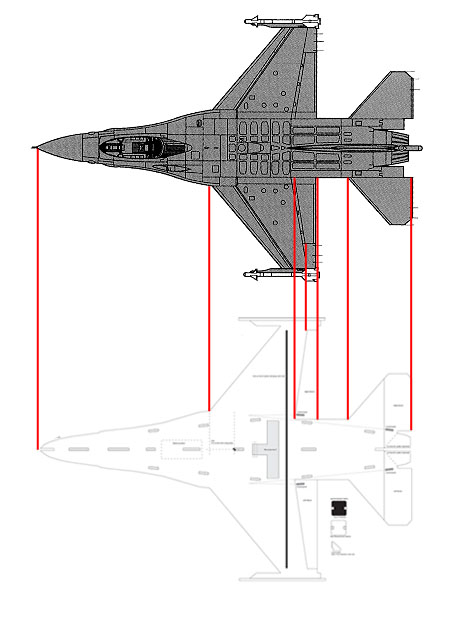 Scusa ma a me non risulta! Potresti spiegarmi meglio cosa intendi?! Riprendendo l'esempio dell'F16 per il fatto che è facile reperire ogni tipo di materiale.. Da questo affiancamento dell'immagine dell'aereo reale e l'immagine del progetto a lastra piatta in depron io direi che le Proporzioni di fusoliera, ala e alettoni,sono pressocchè identiche, tralasciando le ovvie differenze per motivi costruttivi come ad esempio la coda. |