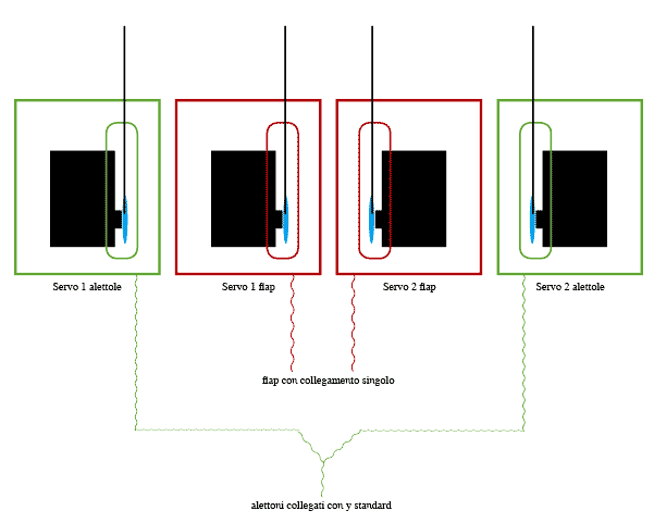 | i servi alettoni van bene con la y perché essendo sovrapposti si muovono uno l'opposto dell'altro,i flap vanno bene collegati singoli ma devi vedere la tua radio come te li fà collegare alla ricevente,che radio hai?