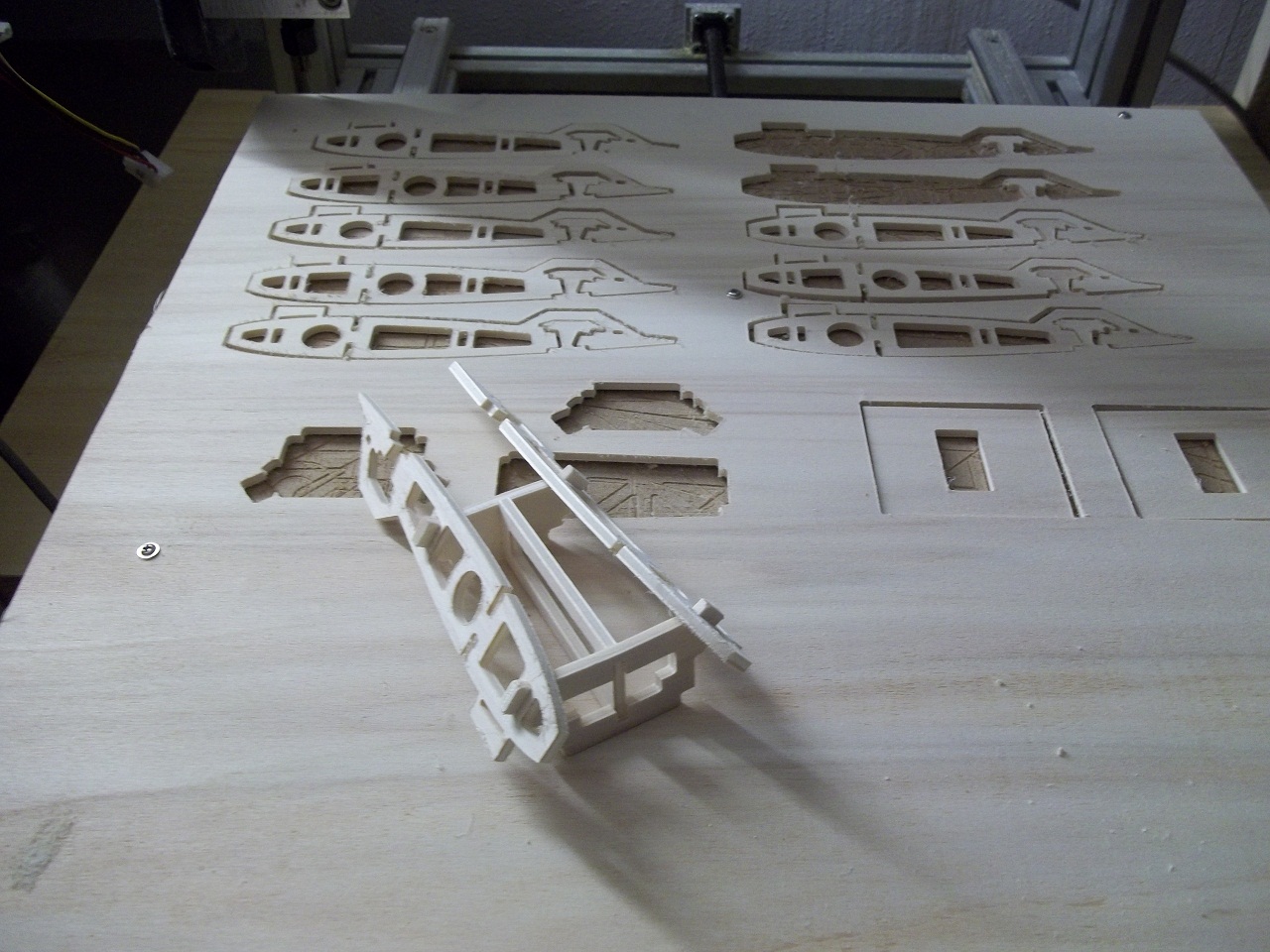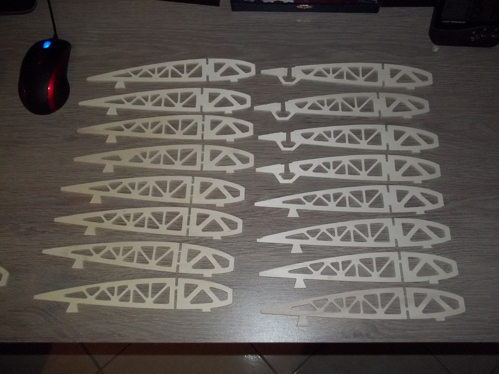 Son partito dal disegno in dxf di un patcwork da 3metri di apertura per arrivare attraverso le opportune modifiche al cad ad un modello di 165cm di apertura alare che sarà motorizzato con un A40-12L e 5celle lipo da 5 Ampere. di seguito alcune fotografie durante il taglio delle parti, la fusoliera essendo molto piu lunga del piano di lavoro della mia CNC e' stata realizzata in 3 parti, con gli opportuni incastri per poterla poi assembrale agevolmente. ![]() ![]()