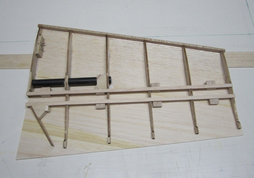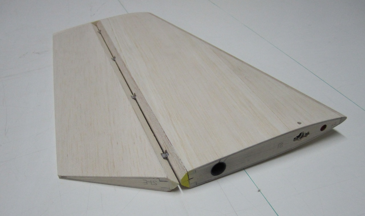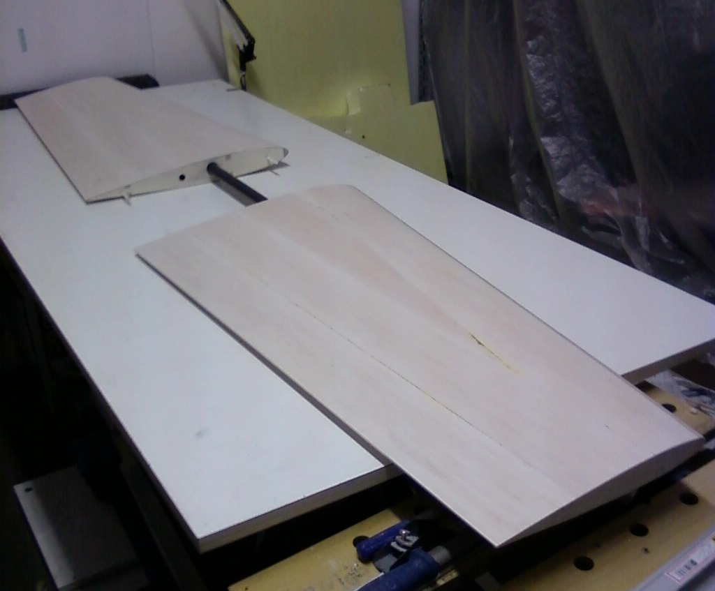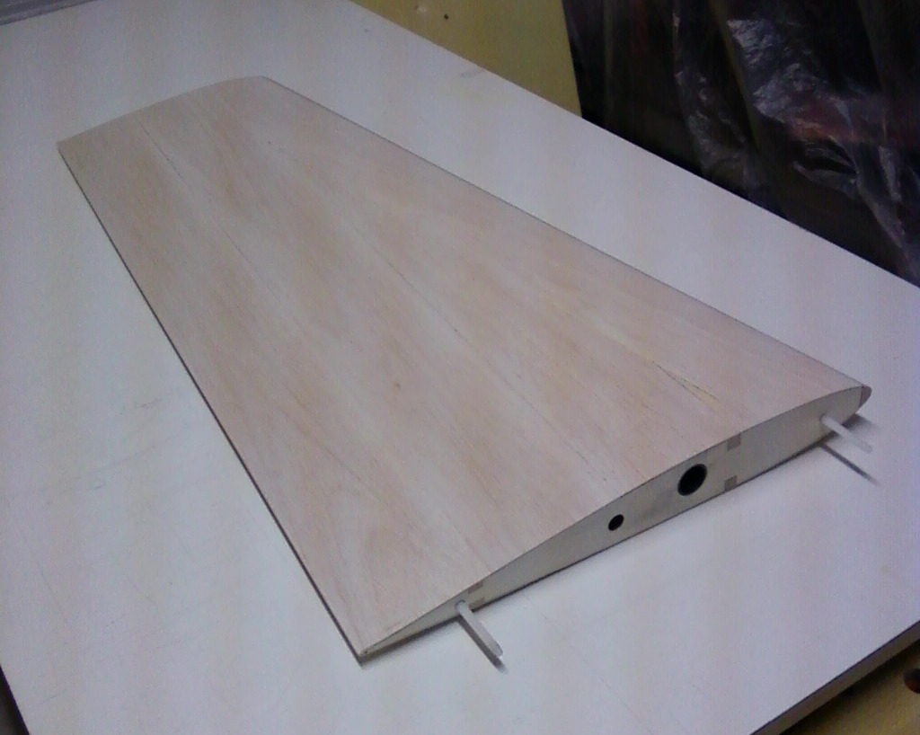ciao,sto procedendo con il rivestimento delle ali con balsa da 2mm: fissati i bulloni in nylon da 6mm per fissaggio ali ora mi rimane da tagliare alettoni e fissare i terminali alari,dopo di che verranno praticate delle aperture di alleggerimento sulle ali ali ultimate, ricavati alettoni ,alloggio servo,ho praticato vari alleggerimenti,e fissato i terminali alari,nella foto gli alettoni non sono ancora fissati,per le cerniere ho usato quelle a perno(ginocchio, bo non so come si chiamano)da 3mm . quindi ala finita come nella foto mi è venuta a pesare 360gr piu 60gr circa di servo,piu oracover,squadretta e rinvii, credo di farcela a rimanere nei 450gr prefissati |