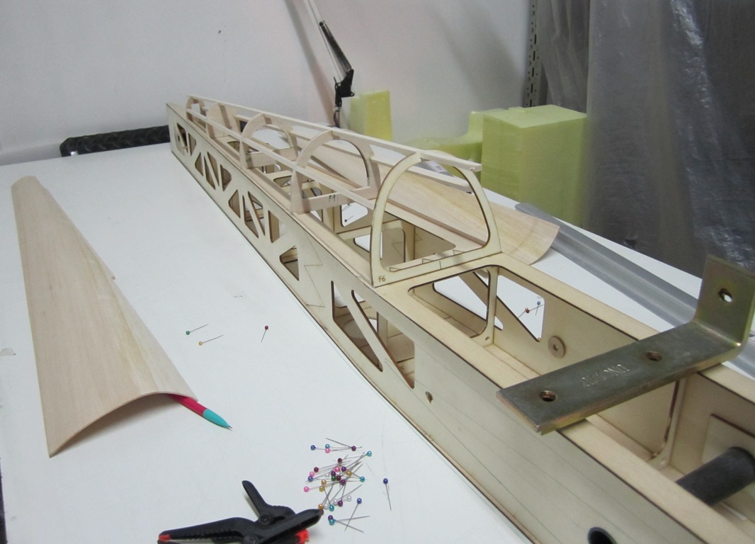 sto procedendo con la fusoliera,all'ultimo momento ho deciso di ricambiare la forma,quindi ho dovuto rifare le ordinate a mano. rivestita tutta la fuso con balsa da 2mm(però una volta scartavetrata per portare tutto in piano sarà diventata in alcuni punti da 1mm,sono felice si risparmia peso) le fiancate sono state incollate con alifatica,mentre il dorso con poliuretanica(ultimamente per incollaggi dove non vedo, la uso molto,mi da piu sicurezza,espandendosi sei sicuro che incolla tutto,però va sempre usata con il contagocce,perche pesa e si gonfia) finora siamo arrivati, come lo vedete nella foto, a 1664gr,obiettivo prefissato 2000/2300 gr (in versione arf) |