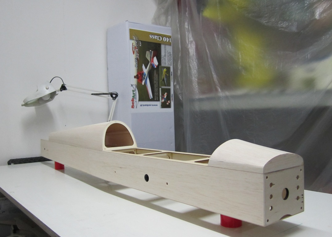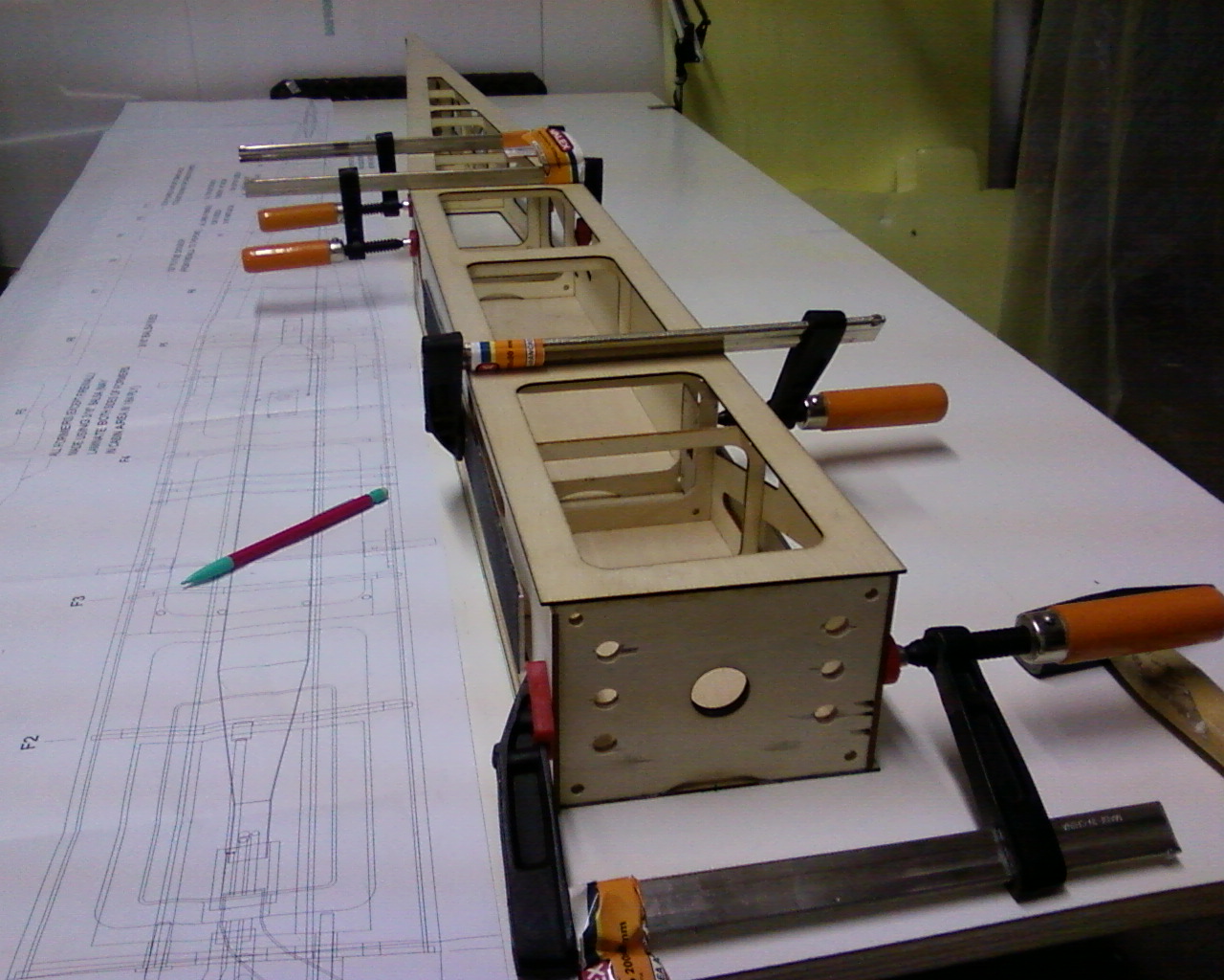 allora dopo le ali,si parte con la fusoliera,ho preparato il tavolo di lavoro,e messo tutto in squadra,per non rischiare di fare qualche fusoliera imbananita,mi aiuterò con dei tracciatori laser. procede il lavoro di assemblaggio fusoliera,incollato lo scheletro e le due fiancate laterali,tutto in compensato da 2mm ad eccezione del parafiamma 4mm,colla usata ciano medio ed epoxi 30m(parafiamma). |