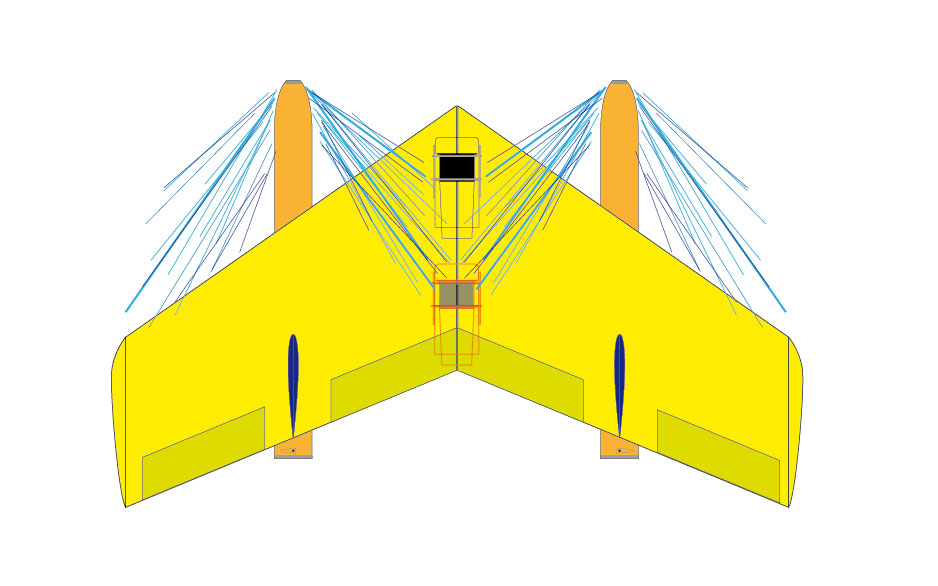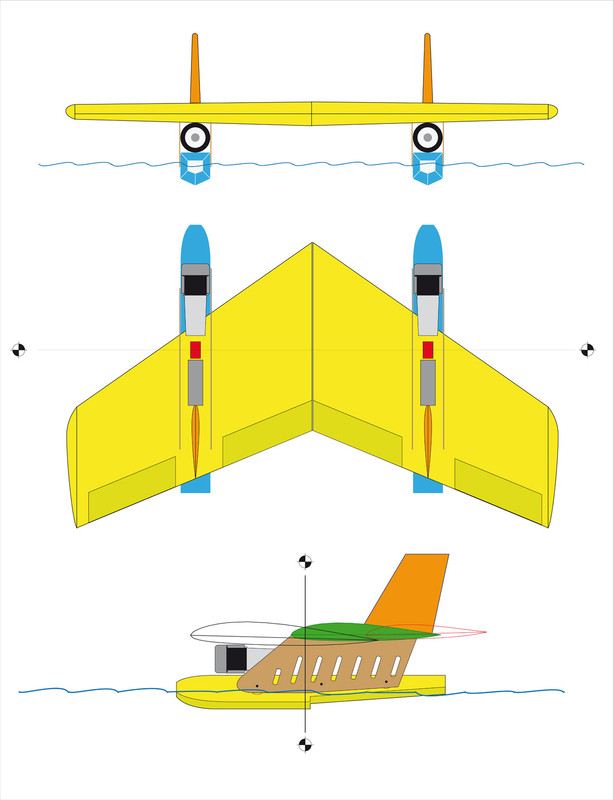 Concordo ma va detto che in molti idrovolanti RC, la distanza tra asse dell’elica e i galleggianti è spesso superiore ai 20 ÷ 30 cm.. Comunque, per diminuire sensibilmente il momento picchiante della ventola, l’unica soluzione sarebbe installarla sotto l’ala. Ma in questo modo la girante si troverebbe vicinissima all’acqua e non protetta in alcun modo dagli spruzzi. Quindi la mia mente malata ha partorito una nuova versione del Flying Boot (la quarta), che a scanso di equivoci, garantisco che rimarrà solo sulla carta. ![]() Si tratta in sostanza di utilizzare due ventole da 64 mm. (dato che due da 70 sono troppo pesanti), posizionate quasi sulla punta dei galleggianti e con lo scarico tra le due flange in legno. Così le giranti non dovrebbero essere colpite dagli spruzzi (….forse…) e il momento picchiante verrebbe quasi annullato. Sarebbe comunque necessario aumentare le dimensioni dei galleggianti e distanziarli maggiormente dall’ala, ma con questa configurazione non è un problema. Con 2 ventole i timoni in acqua non servirebbero e idem dicasi per il sistema di cambio di incidenza. Forse si potrebbero evitare anche i direzionali (lasciando le derive senza parti mobili) e in virata usare la spinta differenziale delle ventole controllata dallo stick del direzionale. Un altro svantaggio, oltre al maggior peso e alla maggior complessità, sarebbe che con le due ventole installate sui galleggianti non si potrebbe utilizzare il modello su terra. Comunque sarà già tanto riuscire a far volare il Flying Boot con una sola ventola e non ho intenzione di buttare un sacco di soldi per 2 ventole/2 regolatori/2 batterie per poi scoprire che l’idea di un idrovolante tuttala è una gran fesseria. Buon Natale a tutti! ettore | ||||
