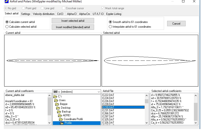Mi sembra di essere tornato a 20 anni fa al tempo delle discussioni con Mario Marzocchi che sosteneva l'inutilità dello svergolamento ( da lui definito svergolanaso ), quando si andava avanti con le proprie idee senza discutere quelle presentate dalla controparte. Anche Mario era contrario a Panknin, mai saputo bene per quale motivo, forse perchè dal foglio di calcolo risultava sempre una certa quantità di svergolamento. Io ho al mio attivo un certo numero di tuttala fatti volare in pendio con discreti risultati la cui progettazione è stata fatta non prendendo niente per scontato, ma confrontando i dati di diversi fogli di calcolo, per poi finire a decidere " a naso " che, per parte mia, ha una discreta dimensione. ![]() A forza di pensarci ho trovato dove sono stati presi i valori introdotti nel foglio dell'X 4, sono calcolati secondo Eppler dal programma Nurfluegel, questo programma consente anche di visualizzare la curva della portanza, forse varrebbe la pena darci un'occhiata. |
