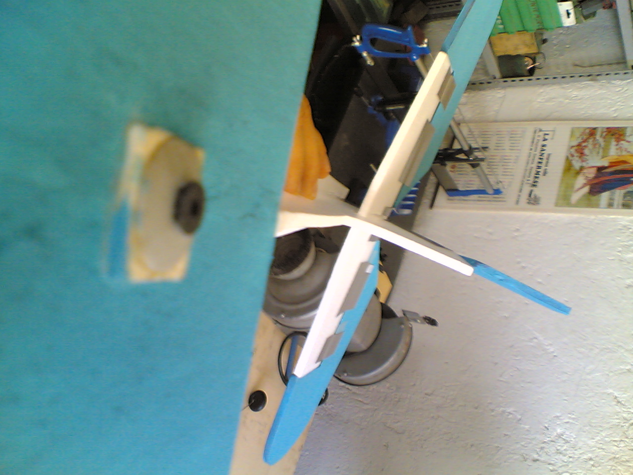 ecco la foto per farvi capire...logicamente la torsione in questo caso l'ho provocata io facendo forza...ma ho paura che in volo faccia la stessa cosa...vorrei rendere la coda della fusoliera piu robusta...faccio notare che il piano che vedete di colore azzurro sono le ali...per dimostrare che non c'è parallelismo tra esse e l'elevatore...