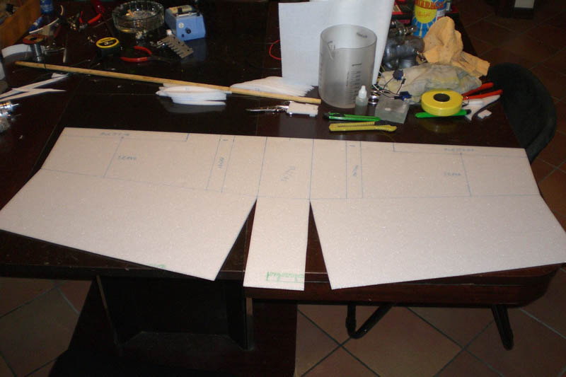 Ho iniziato da poco la costruzione di un aereo molto simile al Piaggio P50... Dal progetto che mi sono fatto, avrà 1 metro di apertura alare, userà 4 speed 400 (con disposizione 2s2p) mossi da un regolatore da 30 A e una LiPo 3 celle da 1800 mAh... Il profilo usato è il classico ClarkY... con 20 cm di corda che finisce a 15 cm sulla punta... La cosa più interessante sarà vedere la reazione dei motori disposti in quella maniera... Intanto allego un pò di foto di quello che ho fatto... Accetto consigli sulla realizzazione... PS: la prima foto è un modellino del P50... |