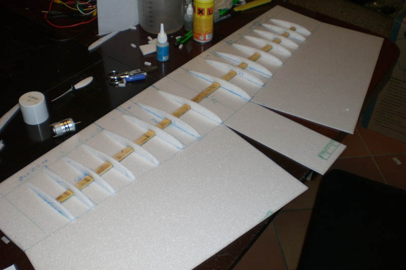 uhm... potevi risparmiare peso utilizzando come longherone due listelli di balsa 6x6 posti nel punto di massimo spessore e unirli con della balsa da 2mm. Tutto molto più leggero e resistente. Il longherone che hai montato, per come è disposto non è ottimizzato per la flessione; cioè potresti trovarti un ala che può flettersi molto a seguito di una richiamata sarebbe stato molto più utile se tu lo avessi montato ruotato di 90°
