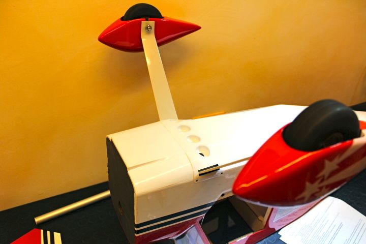 Continuando a lavoricchiare ho pensato di terminare la fase carrello. Per chiudere l' apertura sotto la fusoliera dove vengono fissate le due gambe del carrello, il kit propone un pezzo in ABS stampato piuttosto sottile che deve essere opportunamente rifinito per potersi fissare al meglio. ![]() Con forbici, taglierino e una fresetta sul trapanino in meno di 15 minuti il pezzo può essere rifinito. ![]() ![]() Per il fissaggio sulla fusoliera, invece di attnermi al consiglio del manuale di incollare questa copertura in ABS con cianocrilato, ho preferito fissarla con 4 microviti che mi permetteranno in futuro di smontare di nuovo la copertura. A questo punto, fissate le gambe e la copertura, il carrello è sistemato. ![]() Rimanendo sulla fusoliera, ho studiato come poter fissare il mio OS 160 bicilindrico sul modello e prendendo alcuni riferimenti dimensionali ho iniziato realizzando i fori per il fissaggio del castello motore. Per la cronaca, nel kit viene fornito un castello motore diviso in due parti tipico per motori monocilindro e sulla ordinata parafiamma sono già presenti i fori per il fissaggio del castello motore fornito nel kit (adatto al montaggio di un OS 120 monocilindro), che purtroppo non combaciano con le misure del castello motore che voglio installare. ![]() ![]() Per poter fissare il castello motore nella giusta posizione ho realizzato al tornio dei distanziali in Ergal che mi hanno portato via buona parte del pomeriggio..... ![]() ![]() ....alla fine il castello motore ha trovato il suo posto! ![]() Montando il motore, ovviamente , sono arrivato allo "scoglio" della situazione!! Il motore che sto installando è piuttosto largo essendo bicilindrico, e ovviamente anche più pesante di quello previsto dal kit. Ho provato diversi tentativi per utilizzare la NACA del kit senza doverla "trattare" più di tanto, ma nulla da fare! Essendo la NACA in un pezzo unico stampato in fibra di vetro non calza sul motore per nessun motivo. Quindi ho pensato che l'unica strada è quella di intervenire delicatamente ma radicalmente....... ![]() Ho dovuto tagliarla in senso longitudinale per avere due metà facilmente smontabili in seguito.