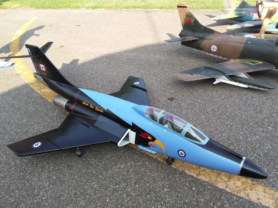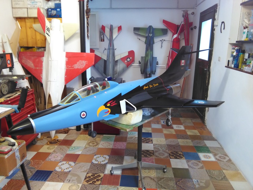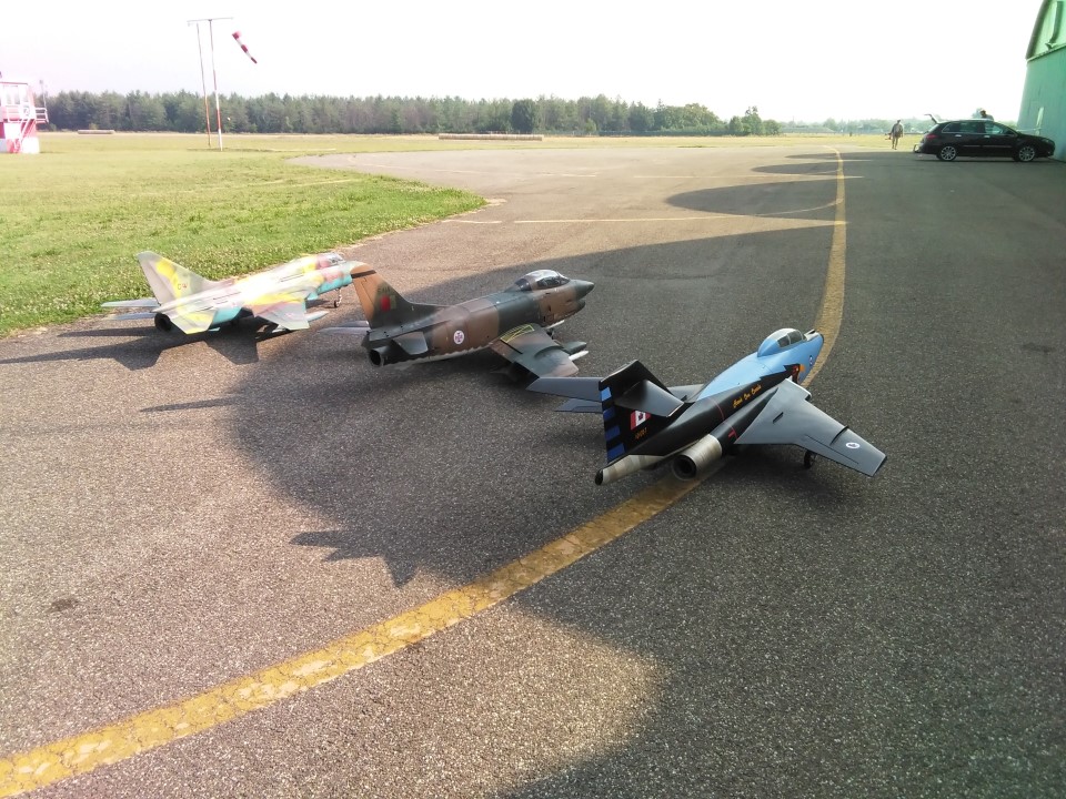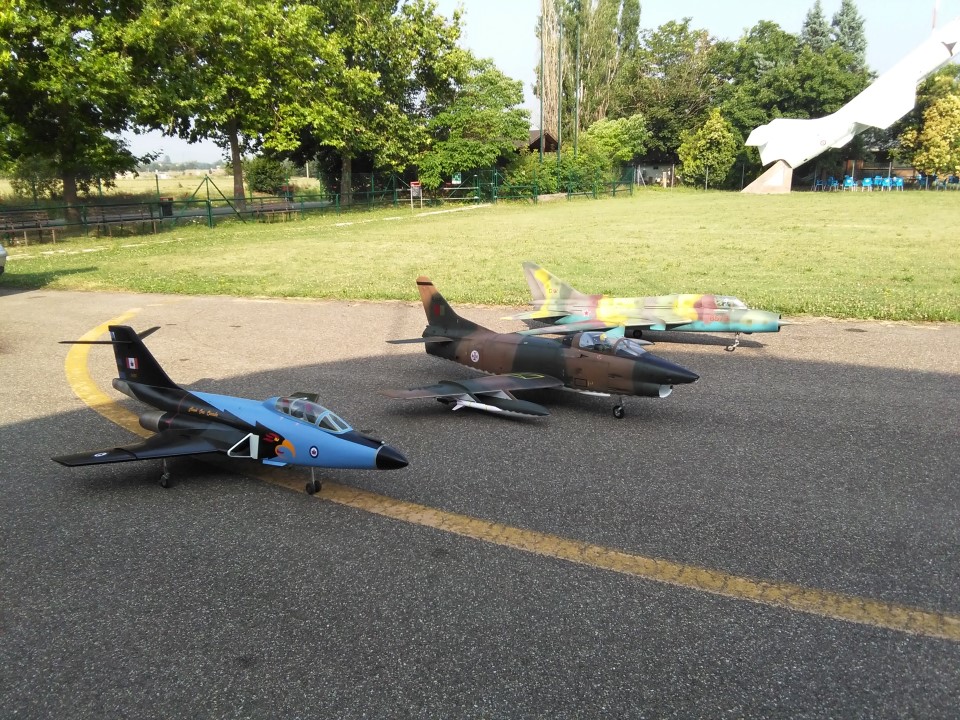 Caldo bollente lunedì a Marzaglia Pochi coraggiosi hanno affrontato una giornata cos' calda, nonostante tutto dovevo collaudare il mio Voodoo, motorizzato Frank Turbines 16gk. Collaudo perfettamente riuscito, assistito da Vando e Stefano Grazioli, non ho toccato nessun trim di correzione! Assetto perfetto!! In passato avevo già fatto volare un altro Voodoo, ma questo è il primissimo prototipo, all'epoca motorizzato da due ventole intubate Ramtec e motori Rossi 105; quindi ho dovuto modificarlo pesantemente per adattarlo alla turbina. Nuova livrea Hawk One canadese Durante la giornata hanno volato Vando col nuovo spettacolare SU-22 e Stefano con l'altrettanto bello G-91 |