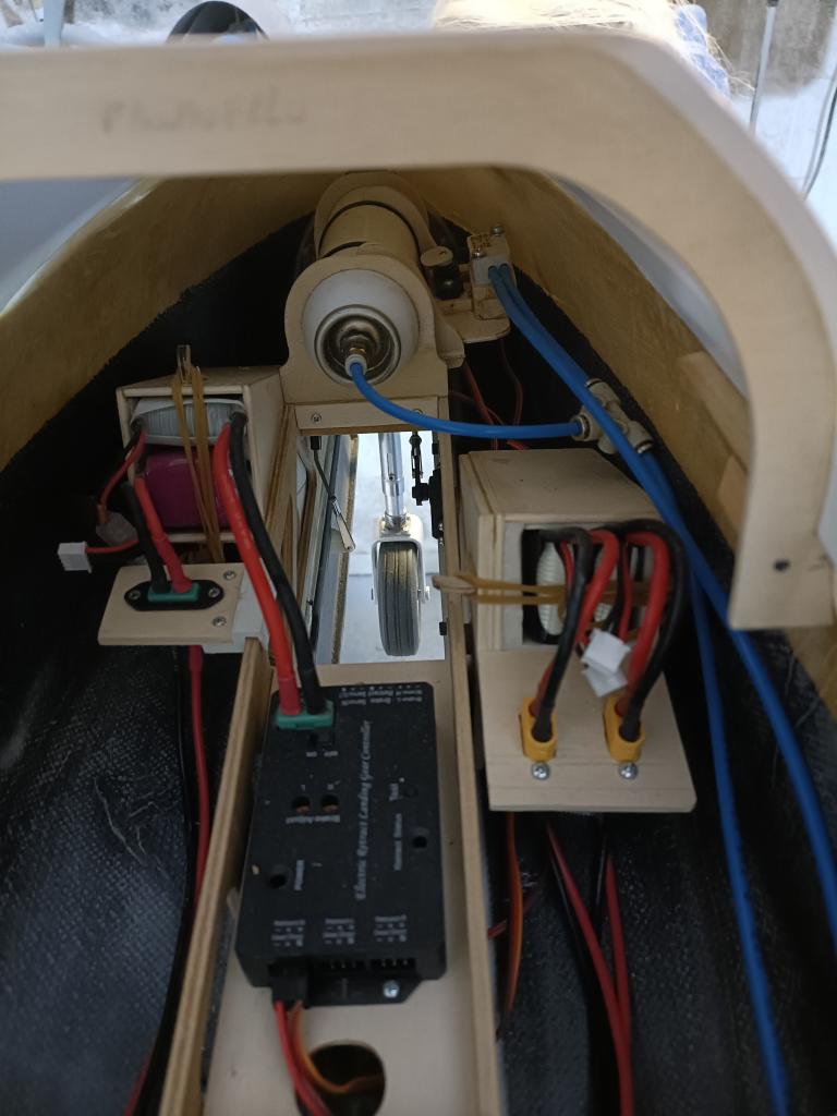 Dopo l’ennesima pausa per svariati motivi, sono riuscito a terminare l’installazione del carrello anteriore con il relativo portello e montare il servo dello sterzo. Per il portello del carrello anteriore, azionato da un servocomando, ho utilizzato il semplice “sequencer” della centralina dei carrelli, purtroppo la funzione “doors” lavora al contrario di come dovrebbe, ovvero chiude il portello a carrello aperto e lo apre a retrazione avvenuta, pensavo di risolvere il problema invertendo la funzione alla centralina ma non ci sono riuscito, ho risolto il problema in maniera poco ortodossa, invertendo la polarità della machinetta del carrello, soluzione un po’ grezza ma funzionale. Mentre il servocomando dello sterzo l’ho messo sulla fiancatina del supporto del carrello, in modo di avere il tirante più corto possibile. la centralina che funziona al contrario ![]() ![]() l'installazione dei servi: ![]()