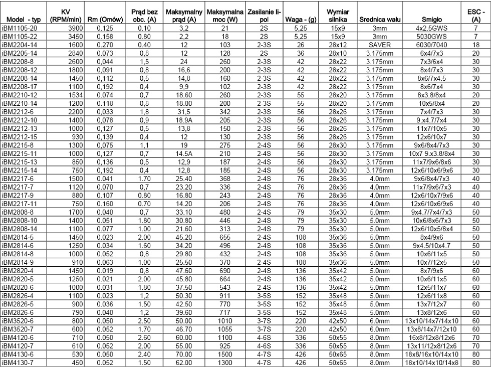 è arrivato il motore n questione e leggendo il codice sulla cassa ho trovato le specifiche. il modello è ibm2826-4. sulla tabella allegata, secondo una mia logica, vengono riportati valori massimi di wattaggio, Amp ed eliche. Quindi avrei con 5s una potenza massima di 911 W a 50,3 A con elica 11x8 (o 12x6). E' verosimile fare un calcolo grossolano per proporzione, a parità di elica, considerando gli ampere assorbiti a 5s, per calcolare gli ampere (e quindi anche i watt) a 3s ?? se faccio il calcolo mi escono circa 30 Ampere, il che vorrebbe dire che potrebbe andare bene l'esc che attualmente è montato sul modello (30A), magari limitando leggermente la corsa del gas (montando l'elica originale 10.5x9). che ne dite? |
