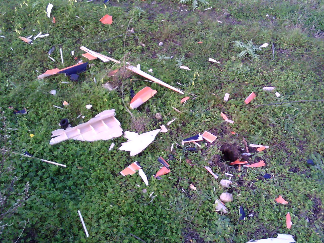 Non è molto che ho ripreso a volare dopo un stop di 12 anni, da meno di un'anno ho ripreso con l'elettrico e il depron, da qualche settimana avevo ripreso a sentire l'adrenalina dell'alcol e l'odore dell'olio di ricino e dopo tre voli da favola, quando stavo cominciando a riscaldare i pollici, ecco il risultato (il motore l'ho recuperato 20 cm sotto terra) E' proprio vero che tutto ciò che vola, in qualche maniera, ATTERRA
