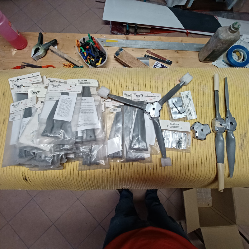 Volendo prendere dell'usato ho la tripala e le due bipala che si vedono in foto. Ho anche un carrello posteriore per Bidule in perfette condizioni con interasse ruote di 75 cm e altezza 25 cm. | |