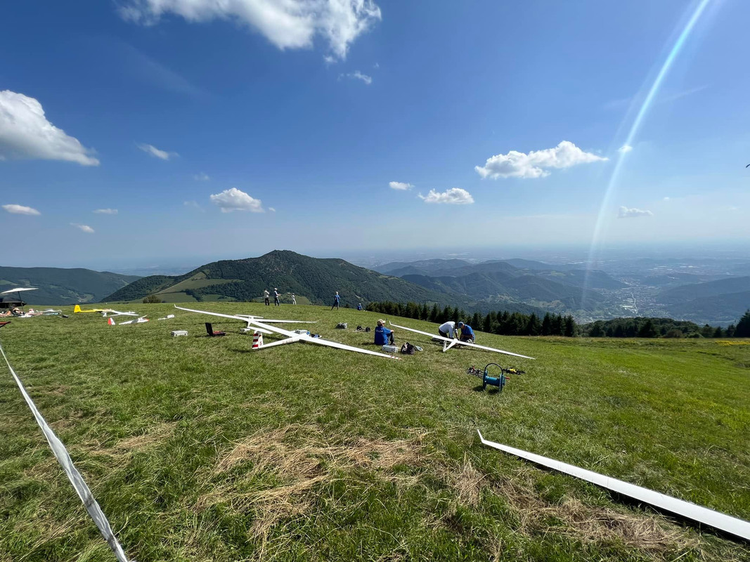 Giornata fuori sede, tra i consoci di S.Fermo glider. La foto è stata scattata da uno dei tanti aliantisti tedeschi o svizzeri che passano una intera settimana a volare su questo bellissimo pendio, tra birra e casunsèi della Baita Tosca. La domenica è riservata ai solo soci. |