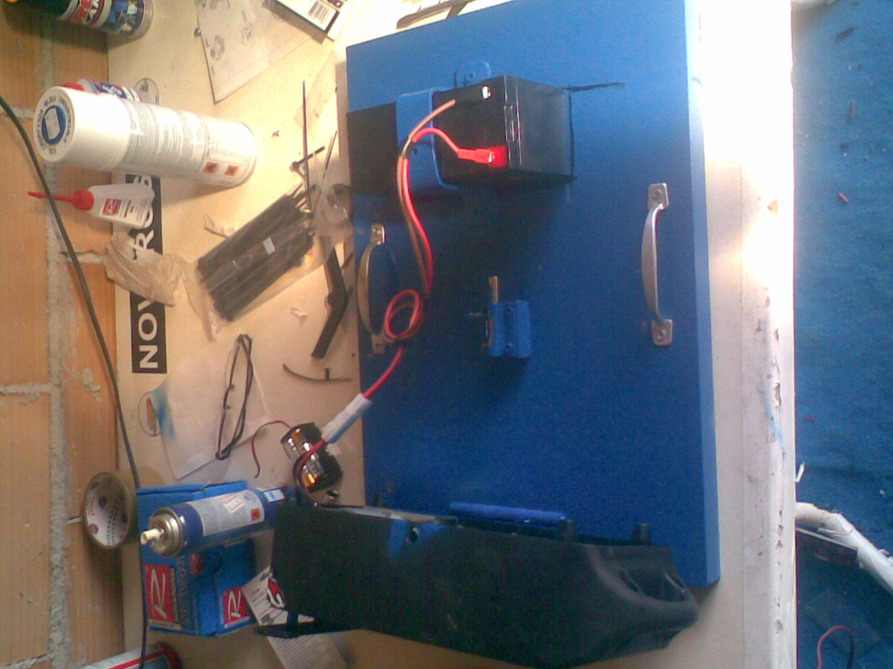 ma no la batteria non ci entrava con i cavetti e poi se dovevo spostare la rotella per accendere il motore da off non ci entrava ancora peggio!!!! allora dato che dovevo portare batteria e avviatore insieme li ho fissati tutti su una base e cmq è abbstanza leggera anche se un po ingombrante ma sto pensando a qualcosa per migliorarla esteticamente................