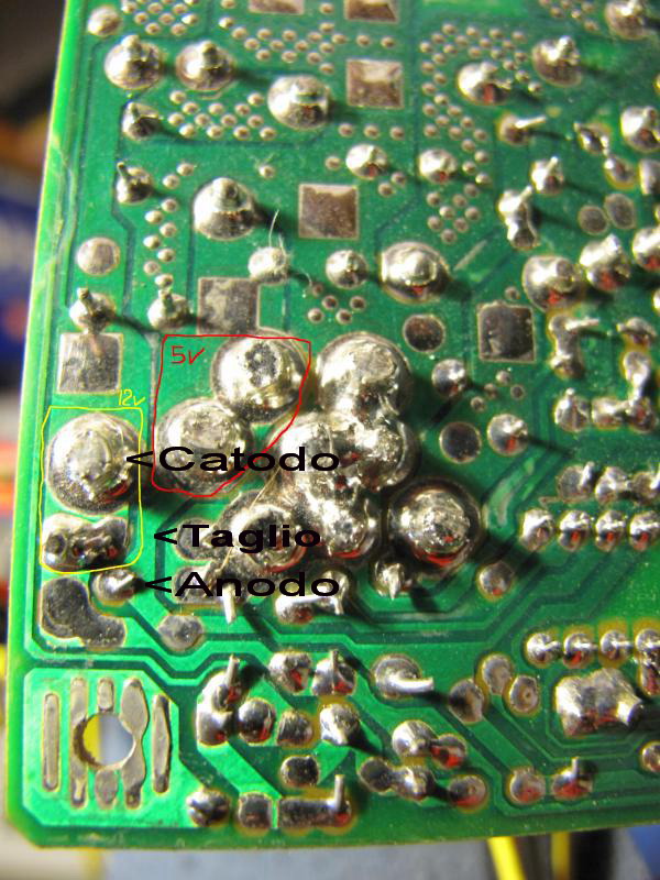 E' indifferente; la corrente che lo attraversa è minima per cui basterebbe da mezzo Watt. Però, visto che hai poca dimestichezza con l'elettronica, prendi quello da un Watt, ha i reofori più robusti e correrai meno rischi nel maneggiarlo e saldarlo. Il catodo, quello dalla parte dell'anello di riferimento, va saldato su un qualsiasi punto della piazzola dei 12V, mentre l'anodo va saldato sulla pista che hai tagliato. Circa il punto di taglio ti ha già risposto l'amico CantZ. | |