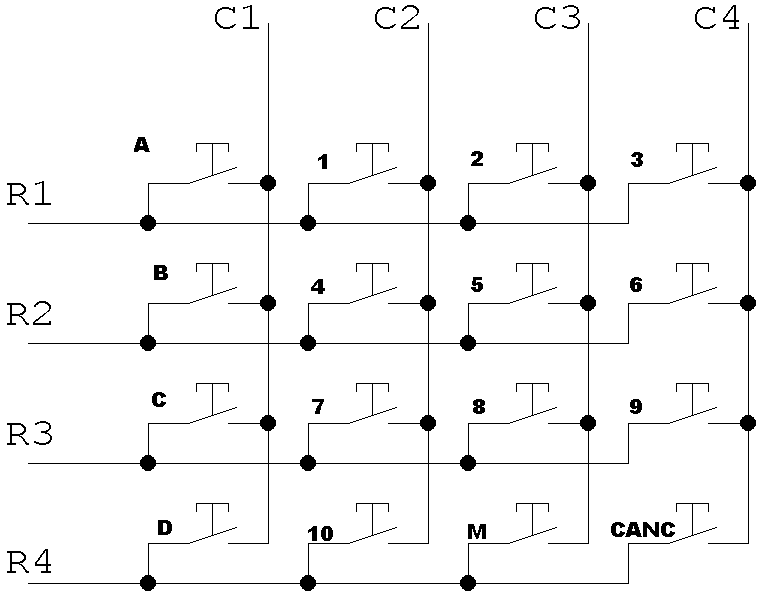 Embè??? ![]() Hai fatto il 90% del lavoro ![]() Metti a 1 un pin delle colonne e verifichi se uno dei 4 pin delle righe è a 1. La combinazione riga-colonna ti dice il tasto. Qual'è il problema???