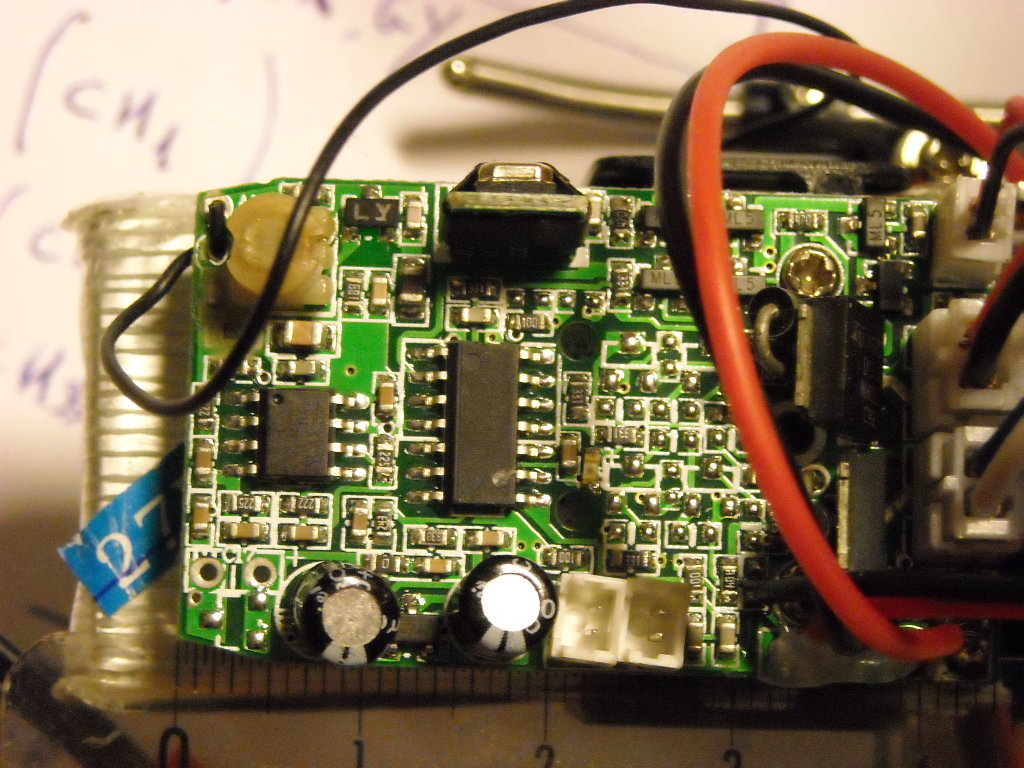 ecco le foto della scheda: misura 44x25mm circa e in evidenza ho messo i mosfet, anche se devo dire che i motori non mi sembrano così esosi come potenza... Ho scoperto che è un syma 9074 con brand revell me ne sono accorto smontando i motori che sono marchiati. ad occhio e croce mi sembra che arduino fio sia la scelta migliore per le dimensioni.....ma ovviamente accetto consigli..........