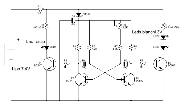 Ho trovato questo schema di lampeggiatore,anche se devo dirvi che non ne capisco tanto di elettronica,ma riesco a capire saldature o polarità dei componenti,quindi vorrei modificarlo: - abbassare la pila con una lipo 7,4,come fare? ![]() ![]() - aggiungere un led lampeggiante al circuito che lampeggi contro tempo agli altri due,dove posso inserirlo? ![]() ![]() Ciao e grazie a tutti ![]() |