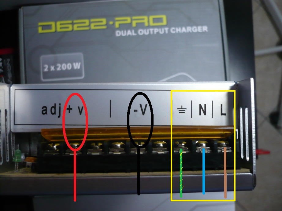| Nella zona gialla a destra devi collegare la tensione di rete 230V -filo terra (giallo/verde) -neutro (blu) -fase (marrone) nei morsetti a sinistra invece puoi prelevare la bassa tensione, il negativo in un qualsiasi morsetto V- mentre il positivo in un qualsiasi morsetto V+ Con l'alimentatore acceso puoi regolare la tensione in uscita agendo sul trimmer che vedi nella parte sinistra, controllando la tensione di uscita con un multimetro. PS.fai molta attenzione visto che stai lavorando con la tensione di rete a 230V! |