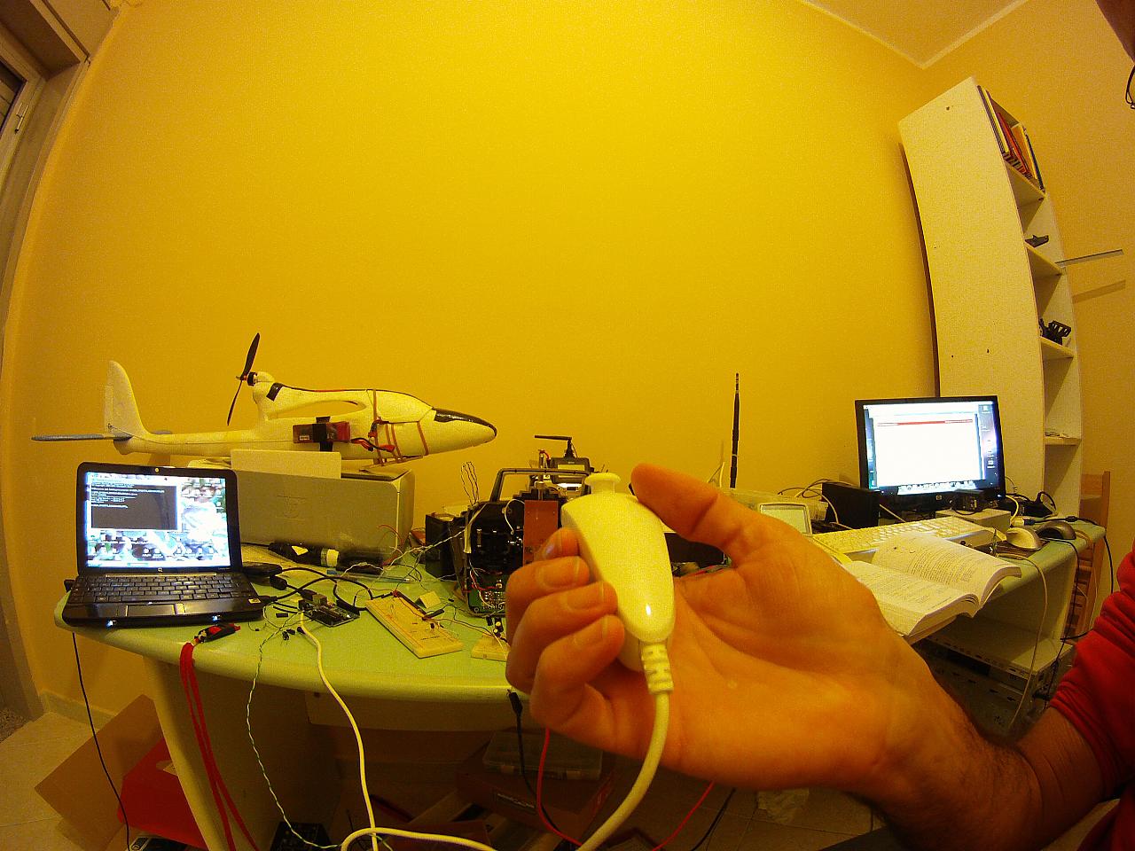 Salve, dopo un po di tempo libero a disposizione, mi sono messo all'opera per costruirmi un head Track artigianale, ho fatto delle prove .. dai test sembra funzionare! Cos'è un Head track ? in volo FPV con occhiali LCD avere la possibilità di pilotare la telecamera solo con il movimento della testa! in questo modo si offre al pilota una sensazione di maggiore realtà nel volo, voi girate la testa verso destra e la telecamera esegue lo stesso movimento. In casa mi trovavo un Nunchuk, non originale dal costo di circa 10 euro, dopo non poca fatica sono riuscito a captare il segnale protocollo I2C, dei sensori accellerometri, ricordo che l'affare invia anche i dati del Joystick di bordo e dei due bottoni. Insomma captando solo i due accellerometri che mi servono attraverso la funzione analogWrite(pin, valore_x) comunico in PWM la posizione dello stick della radio. Ovviamente occorre aprire la radio, tagliare i cavetti dei poteziometri ch6 e ch7, creare delle spinette in modo che se domani volete ripristinare la radio sarà sufficiente collegare le spinette, ritornando alla funzione originale della vostra radio. Quindi dovete mettere per ognuno dei due potenziometri il GND con quello di Arduino, poi il PWM sullo stesso pin dell'uscita del poteziometro, ovvero il pin del potenziomentro che offre la variazione di voltaggio... per smorzare l'effetto PWM facendo tremare il servo mettete due condensatori da 220 uF 35 V ...in questo modo il servo tornerà ad essere fermo. L'effetto alle estremità è ridotto perchè il duty cycle al 100% implica un segnale praticamene costante ..così come duty cycle 0% ...mentre nelle fasi intermedie ..il servo "balla", quindi usando i condensatori il servo ritornerà fermo ai vostri ordini. In una fase successiva smonto il Nunchuk per estrarre gli accellerometri e disporli in un contenitore apposito. |