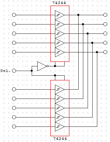 Altra soluzione con 2 SN74244 (versioni ls, hc, hct e' lo stesso). L'ingresso "sel" comanda i pin di abilitazione uscite dei 74244. Se questi pin sono a 1 le uscite sono in alta impedenza, usando la porta not solo uno dei due 244 sara' attivo di volta in volta e propaghera' in avanti i segnali presenti sugli ingressi. In pratica e' un commutatore 5 vie 2 posizioni (in realta' i 244 hanno all'interno 8 buffer per cui con questo schema si potrebbero commutare 8 segnali).