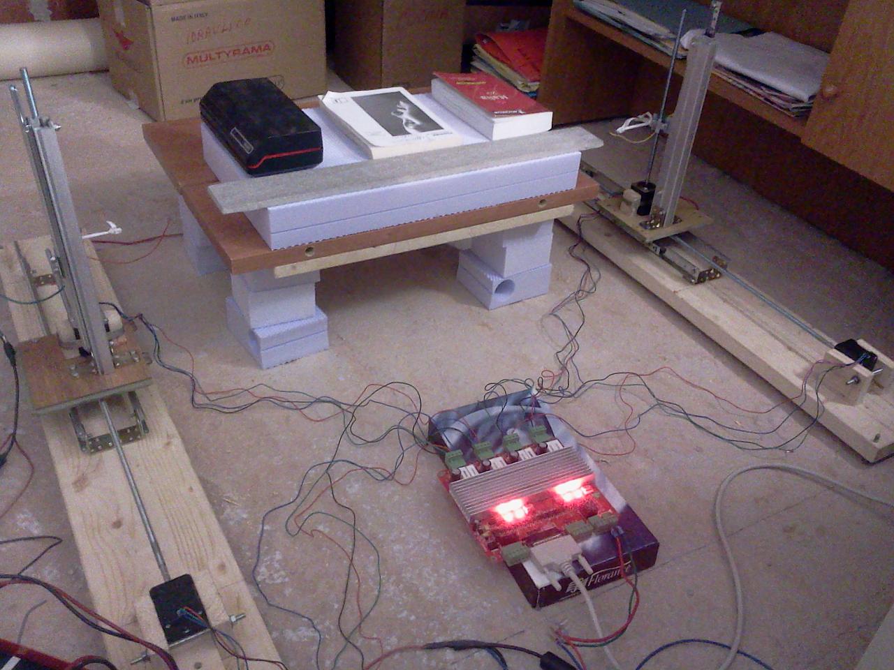 Poi per il resto è quel che vedi. Trovi tutti nei vari castorama o leroy merlin in caso. I due pianali son due tavole di legno spesse 3cm, lunghe 1 metro; le due colonne le ho ricavate da un profilato in alluminio che era un vecchio carrello per le tende, le due basette di legno si posson fare con del compensato da 1 cm. Il tutto è unito con angolari e viti da 5mm. Le barre son da 8mm e le chiocciole son i dadi lunghi raddoppiati con la molla interposta per evitare il gioco all'inversione. Se dovessi rifarla la farei più robusta soprattutto perchè nelle movimentazioni veloci si notano delle piccole oscillazione che non vengono smorzate dalla struttura. Ma ho visto che a basse velocità durante il taglio non danno nessun problema quindi per ora mi va bene così. L'elettronica è la solita: scheda tb6560, motori Nema 17 da 44N*cm. | |