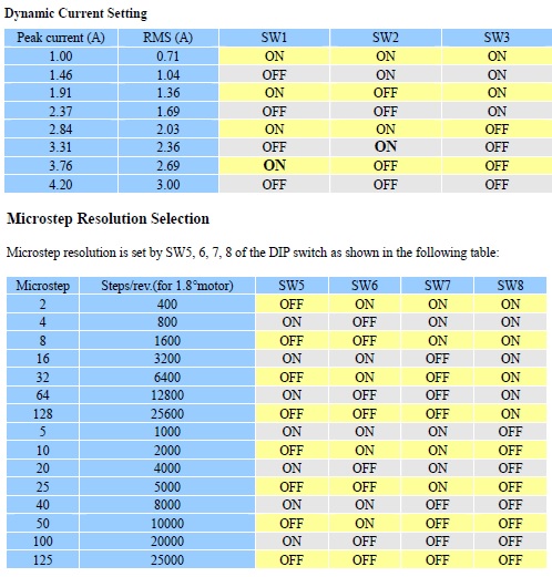 Salve ho questa configurazione: Motori Nema 23 3.0A Driver Motori DQ542MA Puleggia Albero 40 denti Puleggia Motore 20 denti Viti Trapezia 18 passo 4 Non riesco a capire quale valore impostare sui driver DQ 542 MA i step revolution e il dymic current. Se qualcuno mi può spiegare un po... grazie |