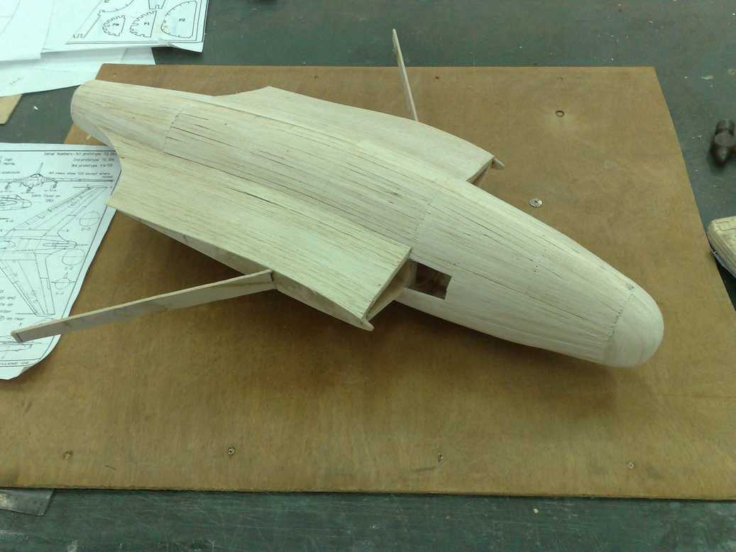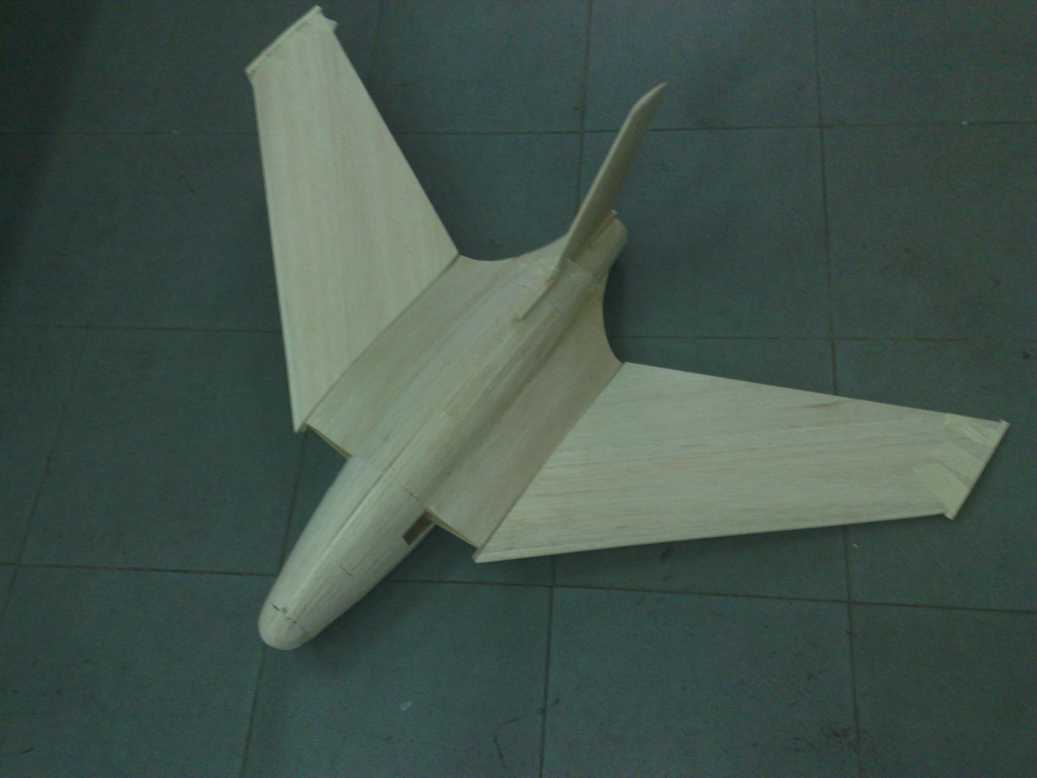 impiallacciato anche le ali dopo aver fatto lo scasso per la baionetta, lo scasso per il passaggio delle prolunghe del servo. Il tutto ora pesa 290 gr. Poi ho montato il tutto per vedere un po le forme.... certo che senza le prese d'aria e il cockpit è bruttino! Manu