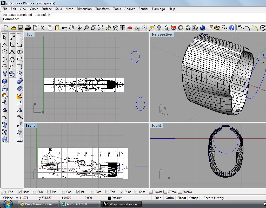 Paura.... ho cominciato a lavorarci, anche se è piuttosto tardi, dopo attente valutazioni e riflessioni sul materiale da utilizzare, la tecnica costruttiva, ecc... Nonn ho scelto la via più breve, come avrei voluto, ma ne approfitto per imparare a costruire completamente da zero...il mio primo "progetto". In questi - pochi - mesi ho fatto esperienza su alcune piccole costruzioni piuttosto semplici, alcune le ho tenute anche "nascoste" per la vergogna (vedi un paio di tutt'ala ...), e mi son finalmente deciso ad intraprendere la costruzione di questo splendido modello, pur sapendo che non sarò in grado di pilotarlo subito... (da qui ad aprile spero di fare sufficiente esperienza al campo!). Mio malgrado ho deciso di costruire - non me ne vogliano i "puristi"- principalmente in polistirolo espanso tagliato con la TGA che mi son costruito. I motivi , strettamente SOGGETTIVI, sono i seguenti: - il polistirolo costa decisamente meno rispetto alla balsa - non ho la necessità di prendere tavolette di balsa di 10000 spessori diversi (un problema GROSSO per me visti i viaggi che continuamente dovrei farmi per reperire la balsa) - voglio far pratica con il polistirolo e ottimizzare la mia tagliacosi , oltre a definire una procedura "standard" per modelli futuri ma soprattutto... l'idea di tagliare tutto da 2 pannelli di polistirolo di spessore definito! Il massimo che sono riuscito a trovare è un polistirolo i colore nero, chiamato "Ecosilver", spesso 8 cm; si può avere una fusoliera di 16cm di larghezza max che vorrebbe dire, rispettando le proporzioni, 170cm di AA...troppo per il contest... Detto ciò, prendendo spunto da tjpianello, che mi ha dato l'idea, ecco A GRANDISSIME LINEE come intendo procedere: - Digitalizzazione del modello da trittico utilizzando Autocad e Rhino - creazione delle sezioni per i file di taglio con GMFC - unione fusoliera - taglio ali (proably un bel Clarky....) e impiallacciatura in balsa - ricopertura del modello in fibra Ho usato un bel po' Autocad e Solidworks...Rhino praticamente mai, e qui avrò bisogno dell'aiuto di esperti. Per il momento sono ancora fermo alla prima fase, ovvero il disegno...e tutto mi sembra un gran casino! Ieri notte non sapendo che fare mi sono messo a disegnare le ordinate e ho pasticciato un po' con Rhino, giusto mezz'oretta per vedere se fosse fattibile la cosa. Per il momento sembrerebbe di sì... Mi faccio un "in bocca al lupo" da solo, sperando di imparare molto e di riuscire ad ottenere dei buoni risultati. A presto!