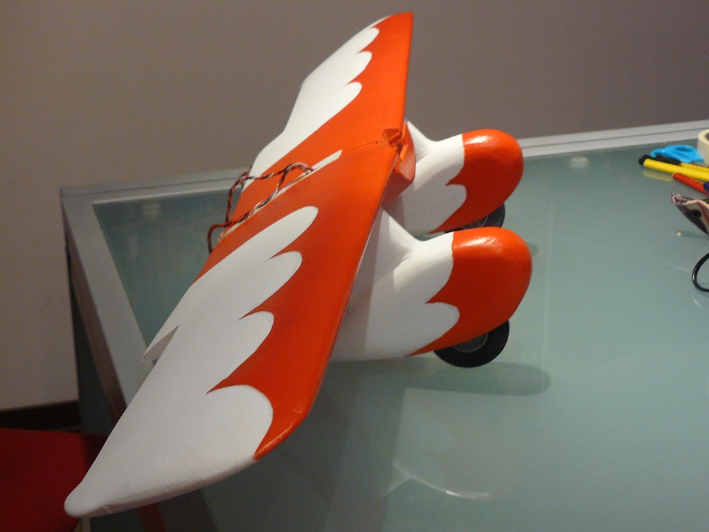 Appena ho montato tutto mi sono reso conto che la carena motore era venuta con una sfumatura diversa di rosso. Quindi ho carteggiato tutto, dato il fondo bianco e ridato il rosso. Gli acrilici sono molto trasparenti e quindi avere o non avere un fondo chiaro fa la differenza sul risultato finale. Ho fatto i filetti neri che dividono il bianco dal rosso con il pennello, il risultato è stato un po' impreciso. Come era da aspettarsi del resto. Avrei dovuto proseguire sulla strada delle mascherature, ma con il problema del nastro che non attaccava e il poco tempo ho dovuto comunque procedere. Ho stampato tutte le decals su carta, le ho incollate con vinavil e finito tutto con una mano di trasparente. Quindi il modello è finito e pronto al volo. Unica vera pecca è il peso. Non sono riuscito a stare sul chilo Il peso in ordine di volo è 1260gr Spero che non sia troppo e che non renda il volo troppo impegnativo |