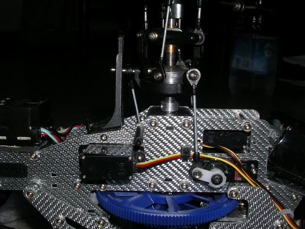 Salve, sto facendo delle prove "al banco" per controllare le diverse impostazioni ovviamente senza pale,ci tengo alla vita ![]() La cosa strana però è che il piatto, a parer mio(ma anche se sono un principiante credo che sia un parere oggettivo), si muove in maniera strana..vale a dire non è mai orizzontale se non quando il pitch è a 50%, cioè 0°, e se mentre il motore gira provo a cabrare/picchiare o a dare di alettoni si muove in maniera moolto strana e la sua posizione non corrisponde ai comandi che io do. Forse, o sicuramente,ci sarà qualche errore di settaggio o addirittura di "installazione"(vale a dire qualcosa montata male). I canali li ho impostati come segue e i servo sono collegati così: Ch1 THRO: il cavo che viene dal BEC Ch2 AILE: servo anteriore di sinistra Ch3 ELEV: servo anteriore di destra Ch4 RUDD: cavo che viene dal gyro Ch5 GEAR: cavo con un solo filo che viene dal gyro(con inpostazione da radio su questo canale) Ch6 AUX1: servo posteriore(non quello di coda..fin qui ci arrivo )Impostazioni radio: SWASH TYPE: 3 servo a 120° CORSA SERVO(dual rate) al 100% con curva "ammorbidita" dall'esponenziale(EXP) al 40% verso l'estremo dello stick AUTO DUAL RATE ed EXP disattivato REVERSE switch solo sul ch3 in quanto se picchiavo il servo alzava il braccio SUB TRIM 0 su tutti i canali TRAVEL ADJUST non ho idea di cosa sia quindi ho lasciato i valori per tutti i canali al 100% com'erano già impostati(ce ne sono due per ogni canale) SWASH MIX 3 servo 120°, AILE +50%, ELEV +50%, PITCH + 70% EXP attivato CURVA GAS lineare dallo 0% all'80% in NORM CURVA PITCH lineare dallo 0% al 100% in NORM REVO MIX non so cosa sia ed ho lasciato i valori UP e DN a 0 GYRO SENS non la so impostare ma visto che ancora non devo volare non l'ho toccato PROG MIX 1,2 e 3 inattivati,non so cosa siano Ovviamente tutti questi valori valgono solo per il normal, non ho impostato gli idle-up perchè ora non mi servono. Avete idea se c'è qualcosa che non va? Ad esempio, con gli stick al centro, i bracci dei servo con i link dovrebbero essere a 90°? Vi allego le foto con le varie posizioni del pitch e il piatto tutto sbilenco..poi, se non sbaglio, dovrebbero lavorare tutti e tre insieme no? Help me please..