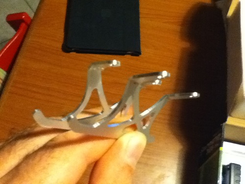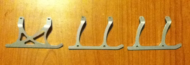 Onlyblade ha notato i pattini che mi sono fatto a causa di una caduta per cui vi posto le foto e una veloce descrizione. Ho disegnato tre versioni di pattino in alluminio da 1,5 mm di spessore, tagliato in fresa e piegato a mano fissando il punto di piega su una morsa da tavolo. L'alluminio è un materiale duttile e le prime prove, realizzate con 1,2 mm, si aprivano ad ogni atterraggio violento (però erano facilmente riposizionabili). Nella foto dei 3 pattini, il secondo (quello con la sagoma più sottile) l'ho usato fino a qualche giorno fa, l'ho sostituito con il terzo perché anche questo ha iniziato a prendere una piega troppo accentuata e dato il maggior spessore risulta difficile da radrizzare; nel complesso ha resistito ad una decina di atterraggi violenti. Il primo della foto è solo una prova: particolarmente rigido ho provato a piegarne una coppia con l'attacco più lontano ed uno come gli altri, così da avere un pattino più largo. Il passo successivo sarà provare a fare i pattini in un pezzo unico, magari con portabatterie anteriore verticale. Salutoni